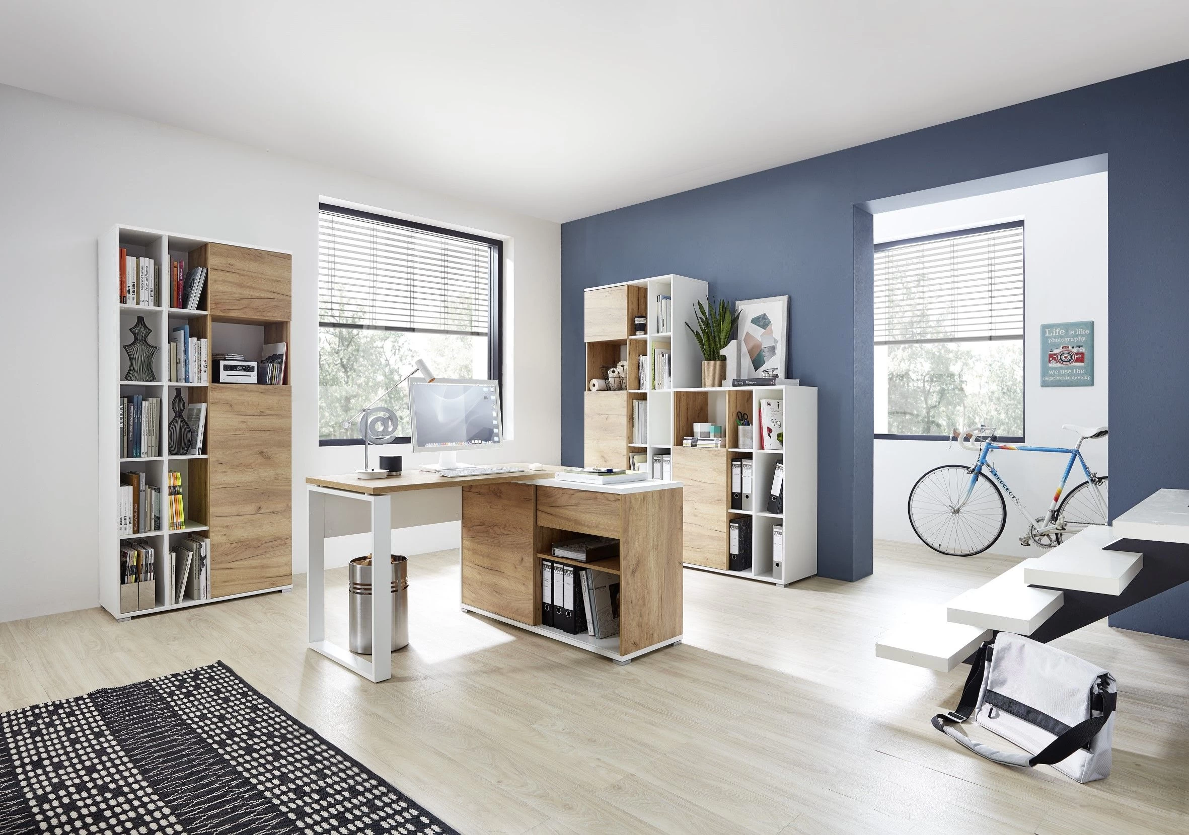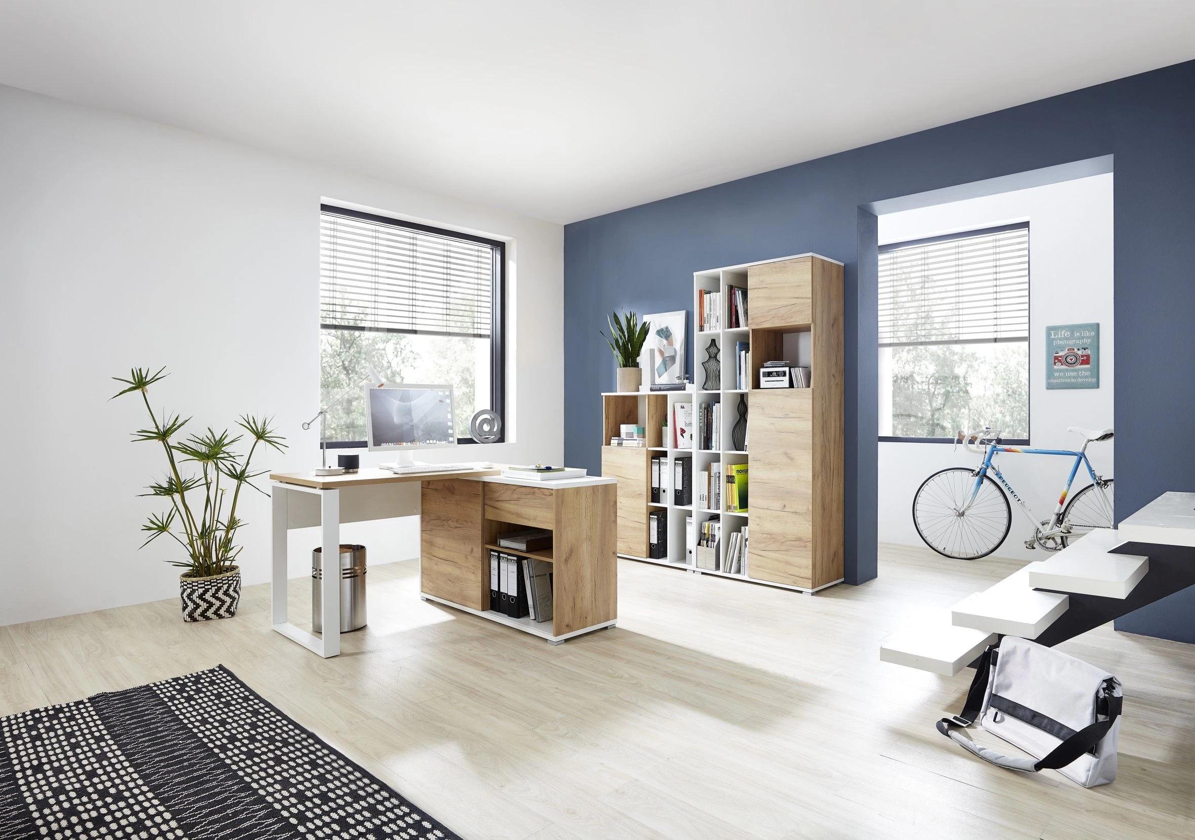 Les armoires Lloris sont le choix parfait pour ceux qui souhaitent un bureau à domicile moderne et scandinave offrant suffisamment d’espace de rangement. Le design est double : une structure blanche combinée à une porte d’armoire et des accents en décor chêne. Cette combinaison est non seulement belle, mais aussi extrêmement fonctionnelle. L’espace de rangement est infini, avec un total de sept compartiments ouverts et deux compartiments fermés derrière la porte. La porte tournante est également équipée d’un système de push-to-open qui permet de ranger proprement vos documents confidentiels. L’unité est fabriquée à partir de panneaux de particules de haute qualité et recouverte d’un revêtement en mélamine. Avec les bords en ABS, cela en fait une unité robuste. Découvrez également les autres meubles de la collection Lloris sur notre site.