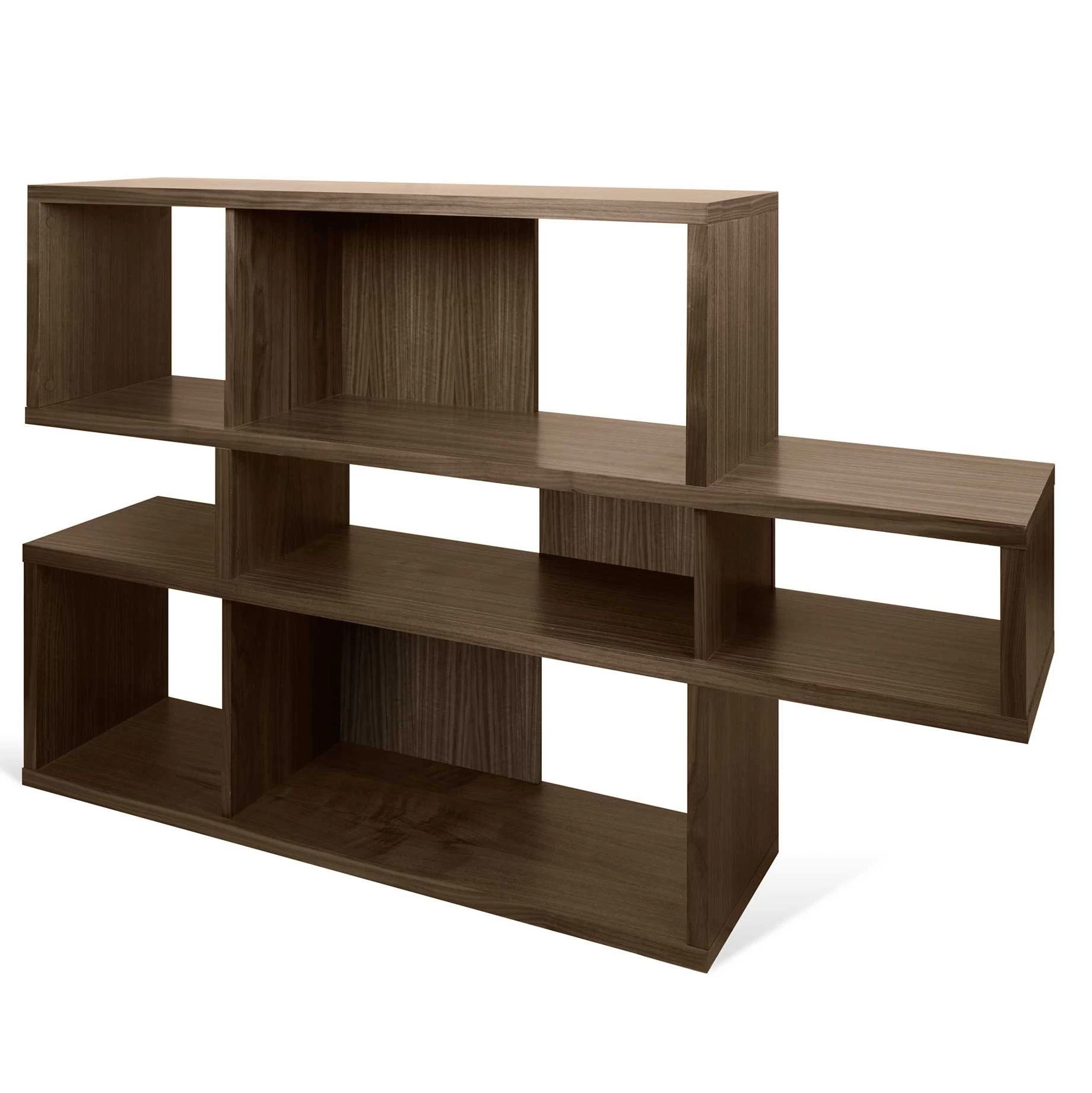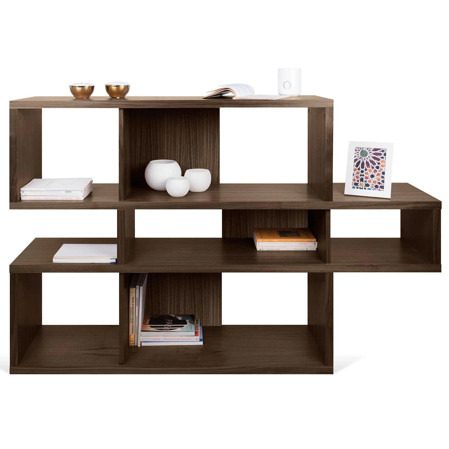 Réalisée en MDF, cette bibliothèque est dotée d’une finition en noyer. Certains compartiments sont pourvus d’un paroi de fond. Chaque niveau est composé d’un grand et d’un petit compartiment.