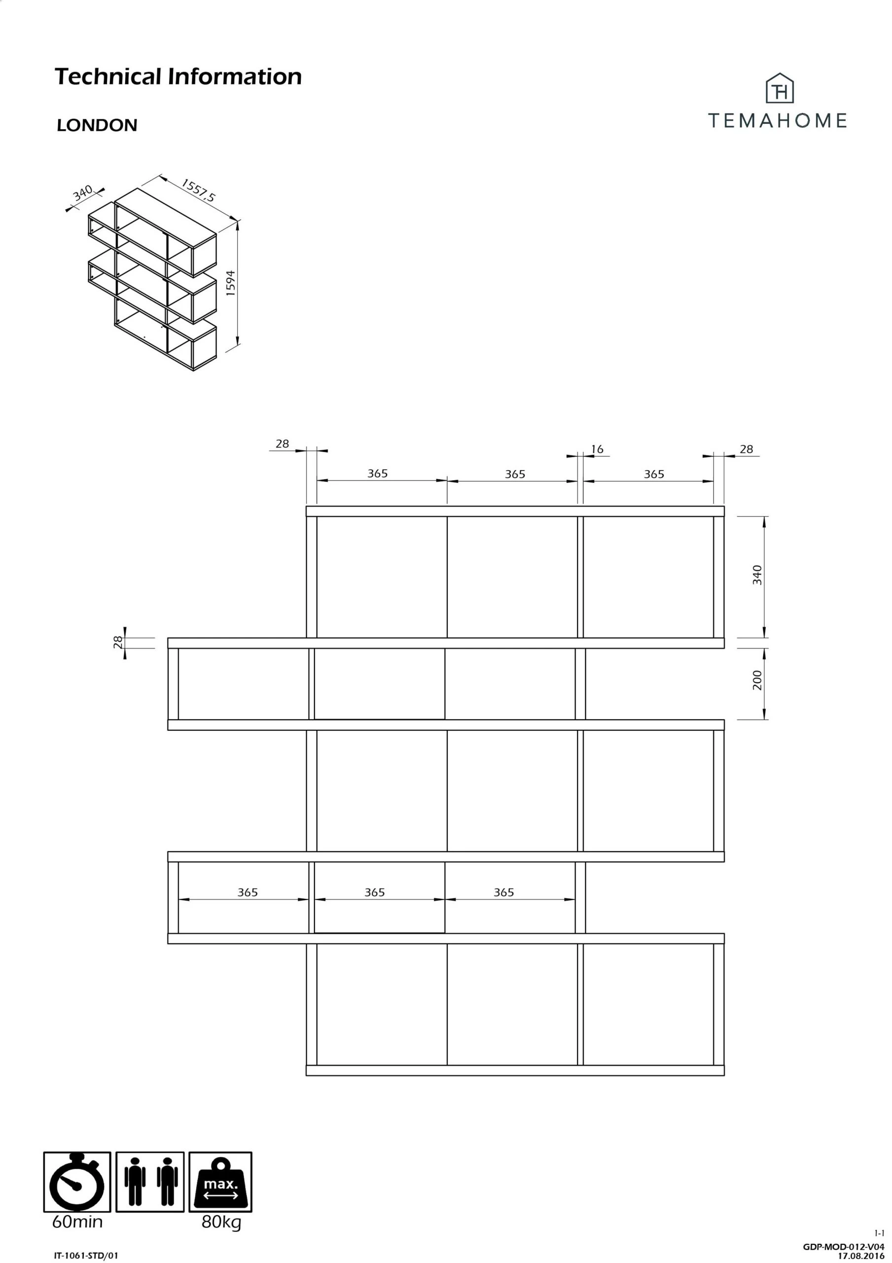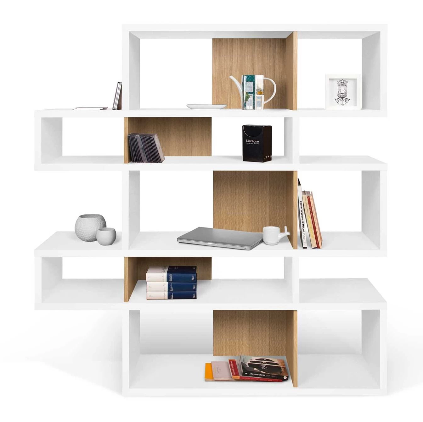 Cette bibliothèque est réalisée en MDF laqué blanc. Certains compartiments sont pourvus d’un paroi de fond à finition en chêne. L’armoire est divisée en 5 niveaux. Chaque niveau est composé d’un grand et d’un petit compartiment.