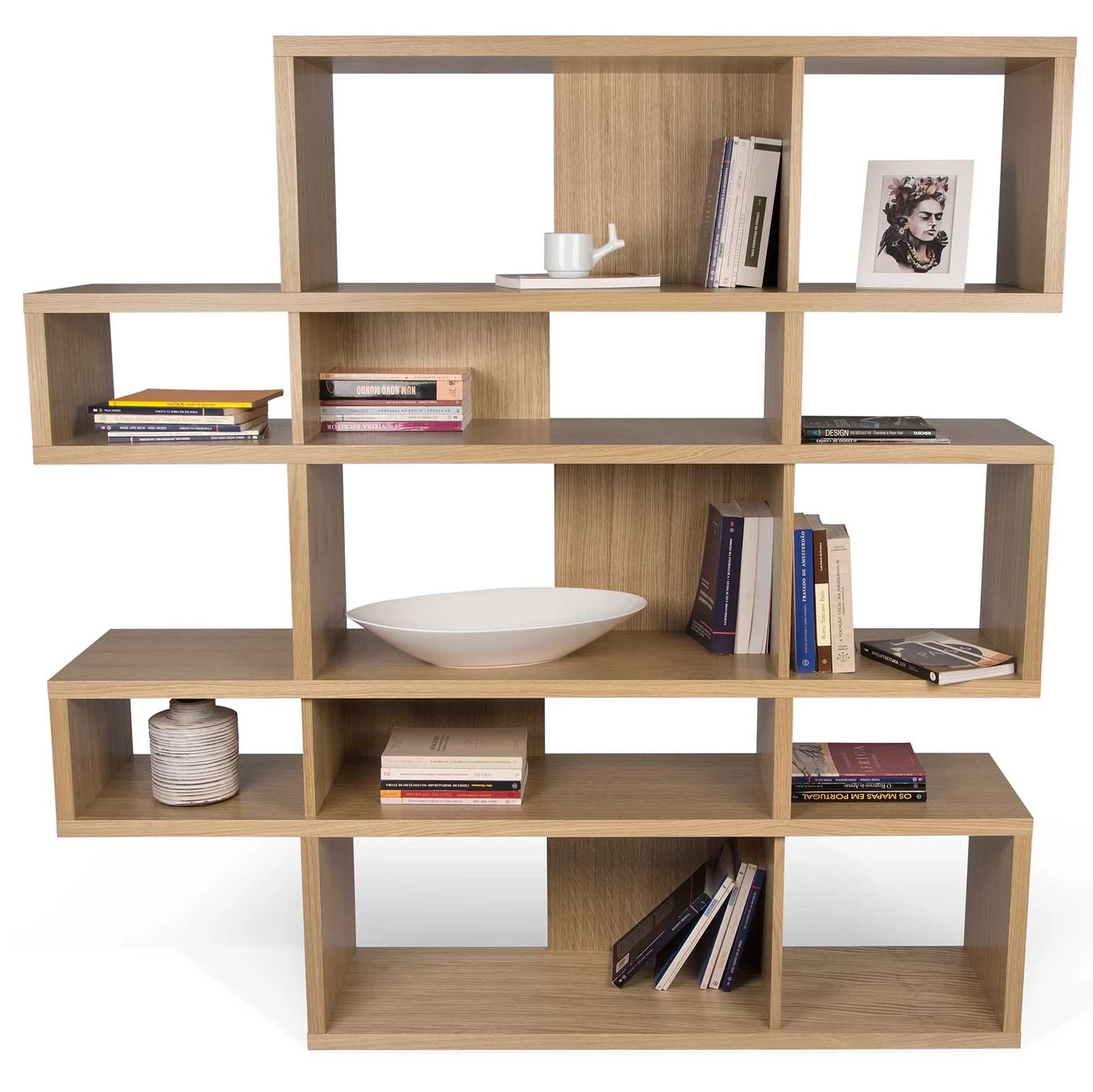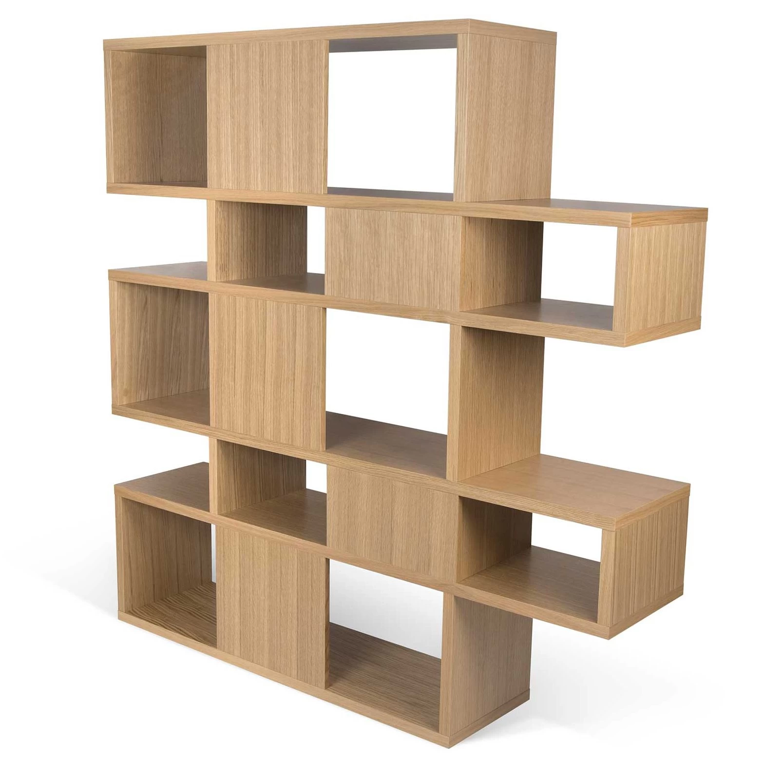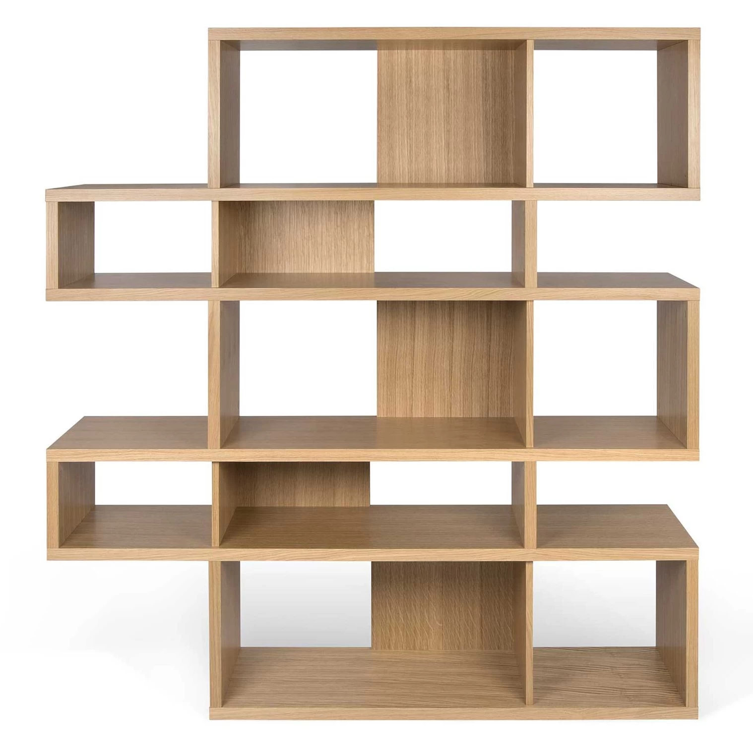 Réalisée en MDF, cette bibliothèque est dotée d’une finition en chêne. Certains compartiments sont pourvus d’un paroi de fond. L’armoire est divisée en 5 niveaux. Chaque niveau est composé d’un grand et d’un petit compartiment.