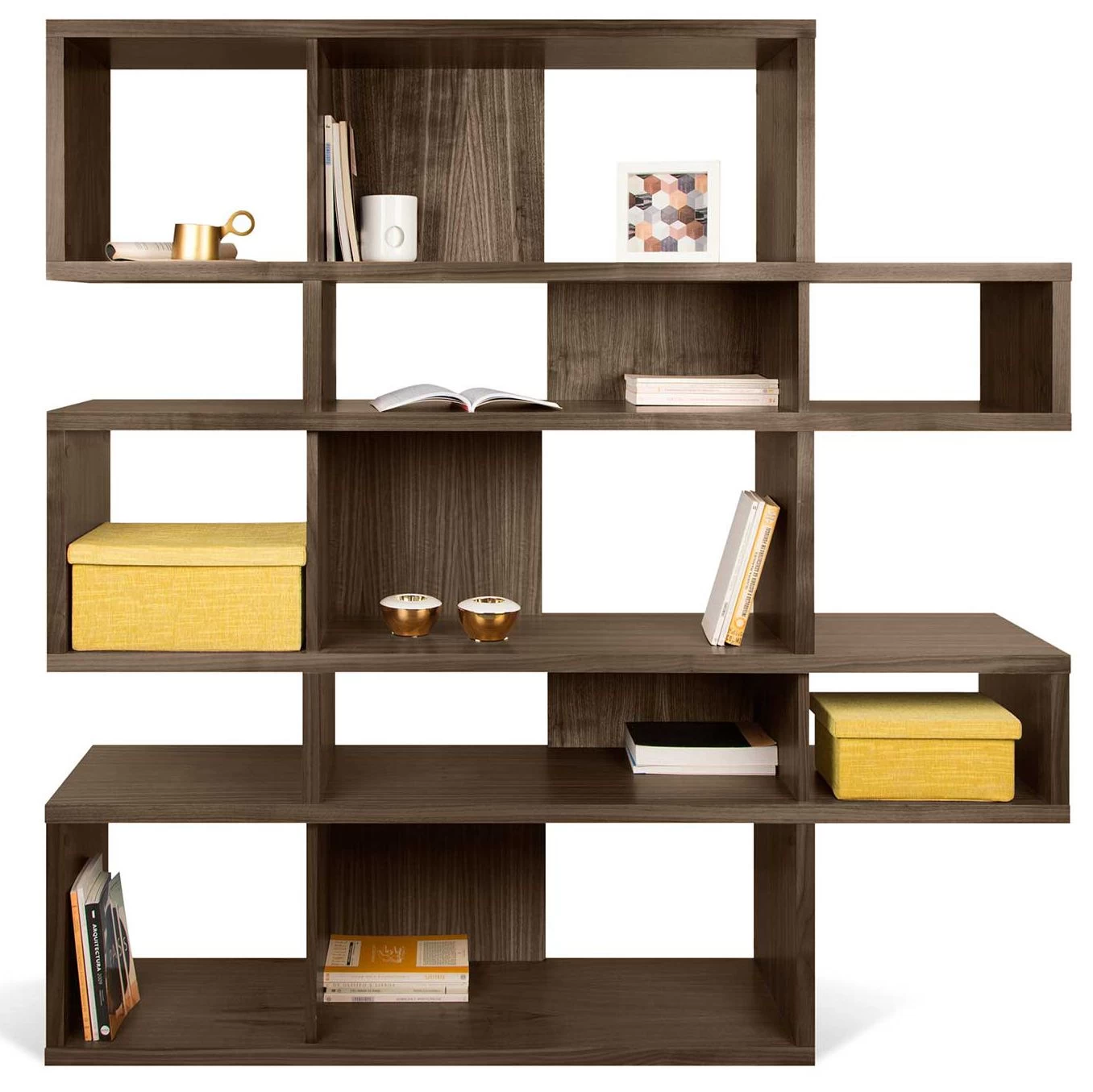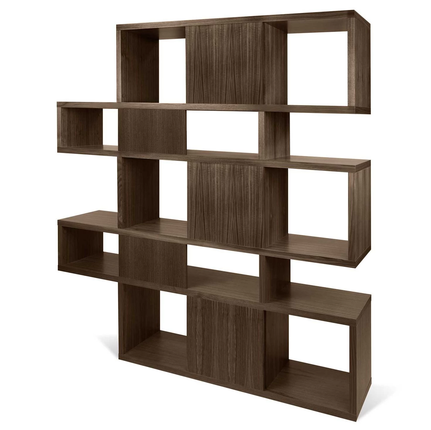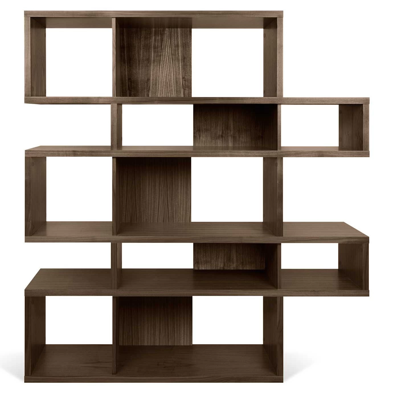 Réalisée en MDF, cette bibliothèque est dotée d’une finition en noyer. Certains compartiments sont pourvus d’un paroi de fond. L’armoire est divisée en 5 niveaux. Chaque niveau est composé d’un grand et d’un petit compartiment.