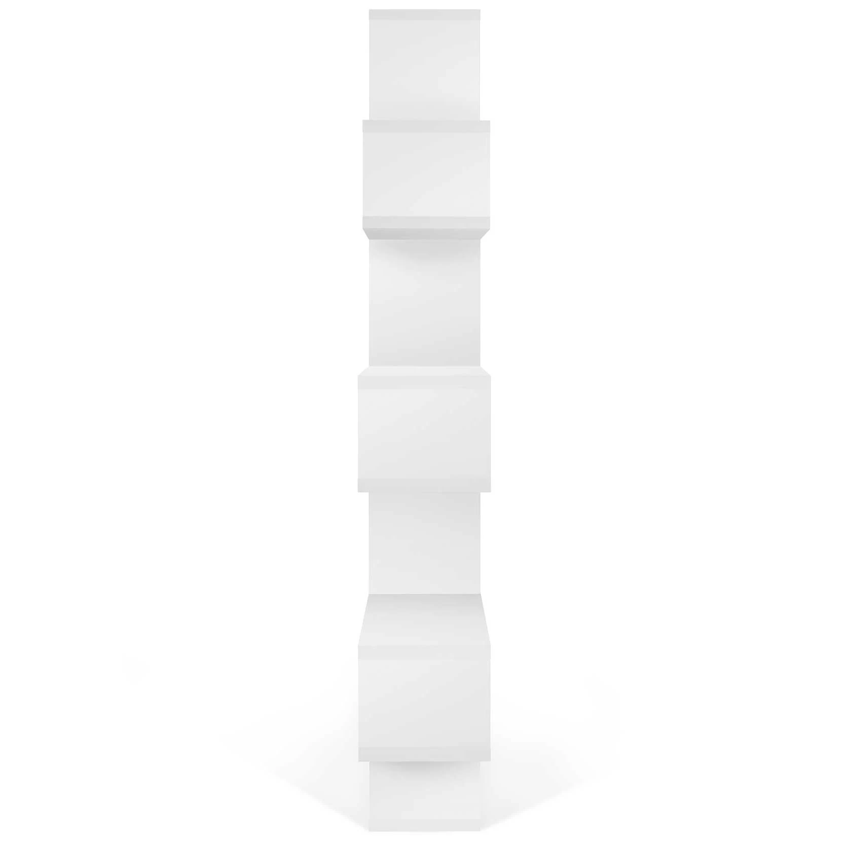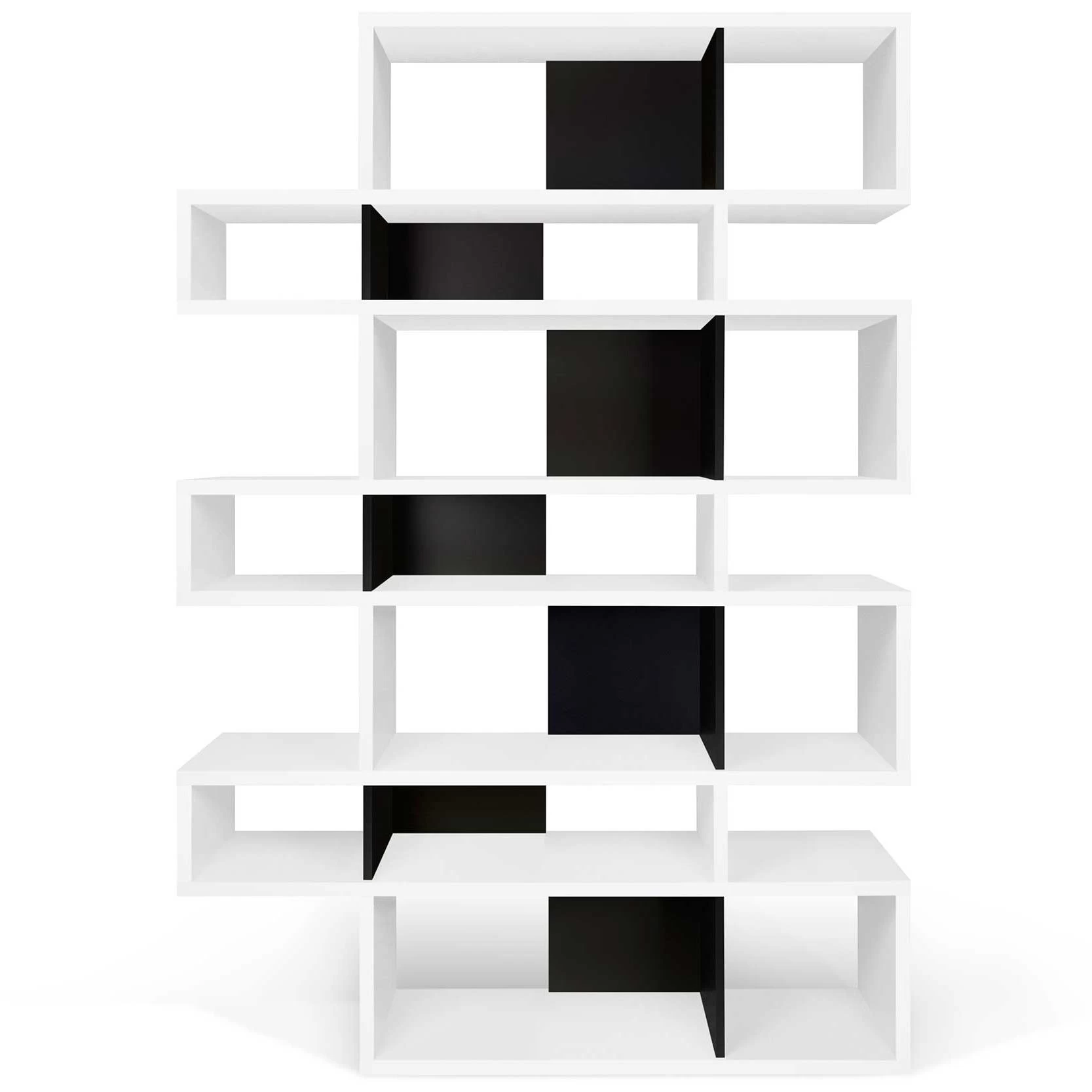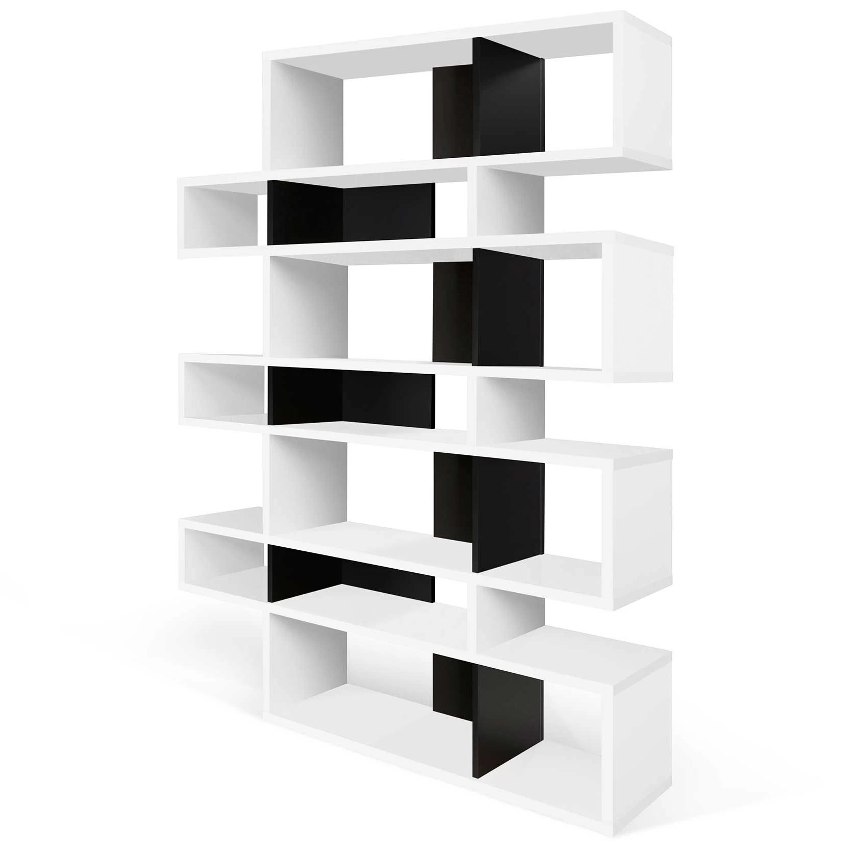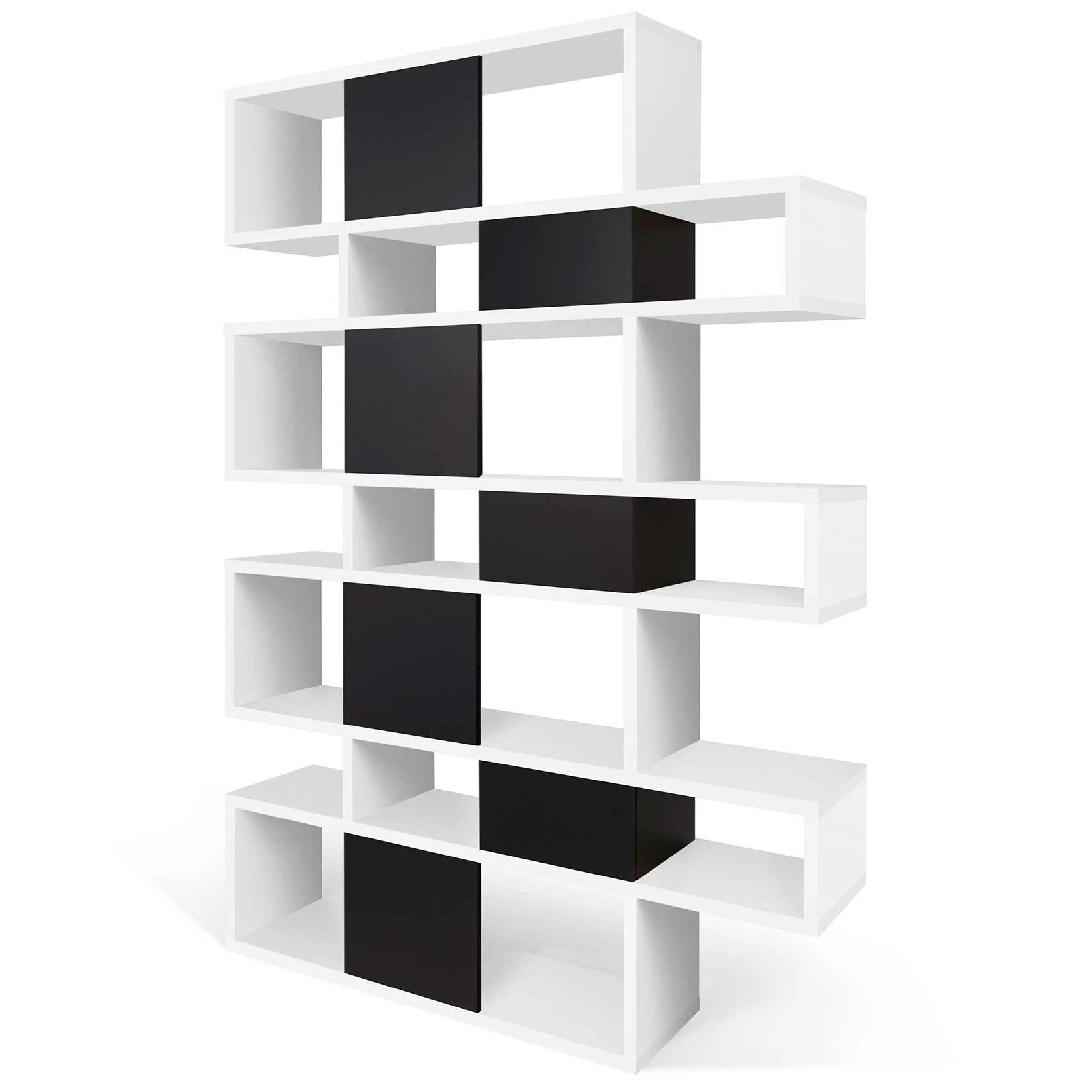 Cette bibliothèque est réalisée en MDF laqué blanc. Certains compartiments sont pourvus d’un paroi de fond en noir mat. L’armoire est divisée en 7 niveaux. Chaque niveau est composé d’un grand et d’un petit compartiment.