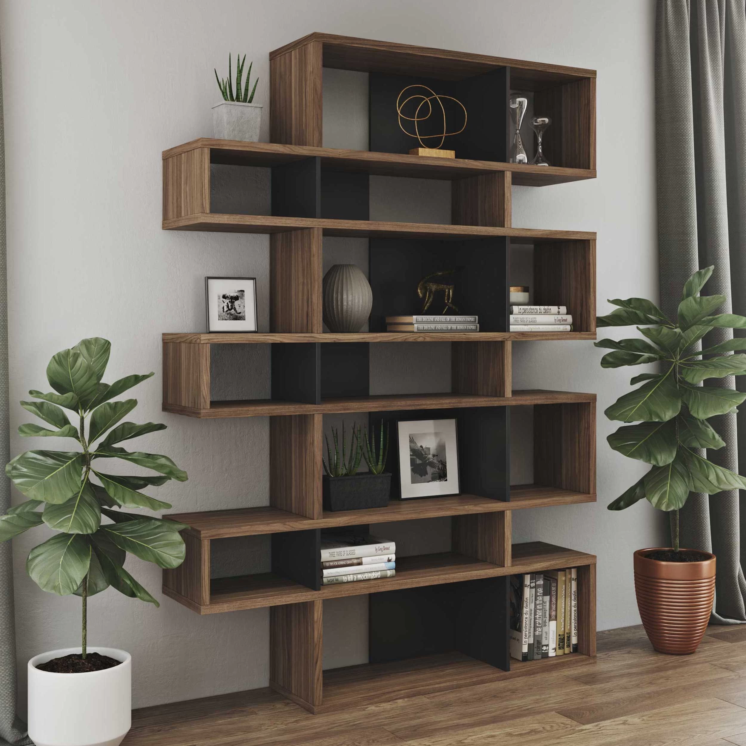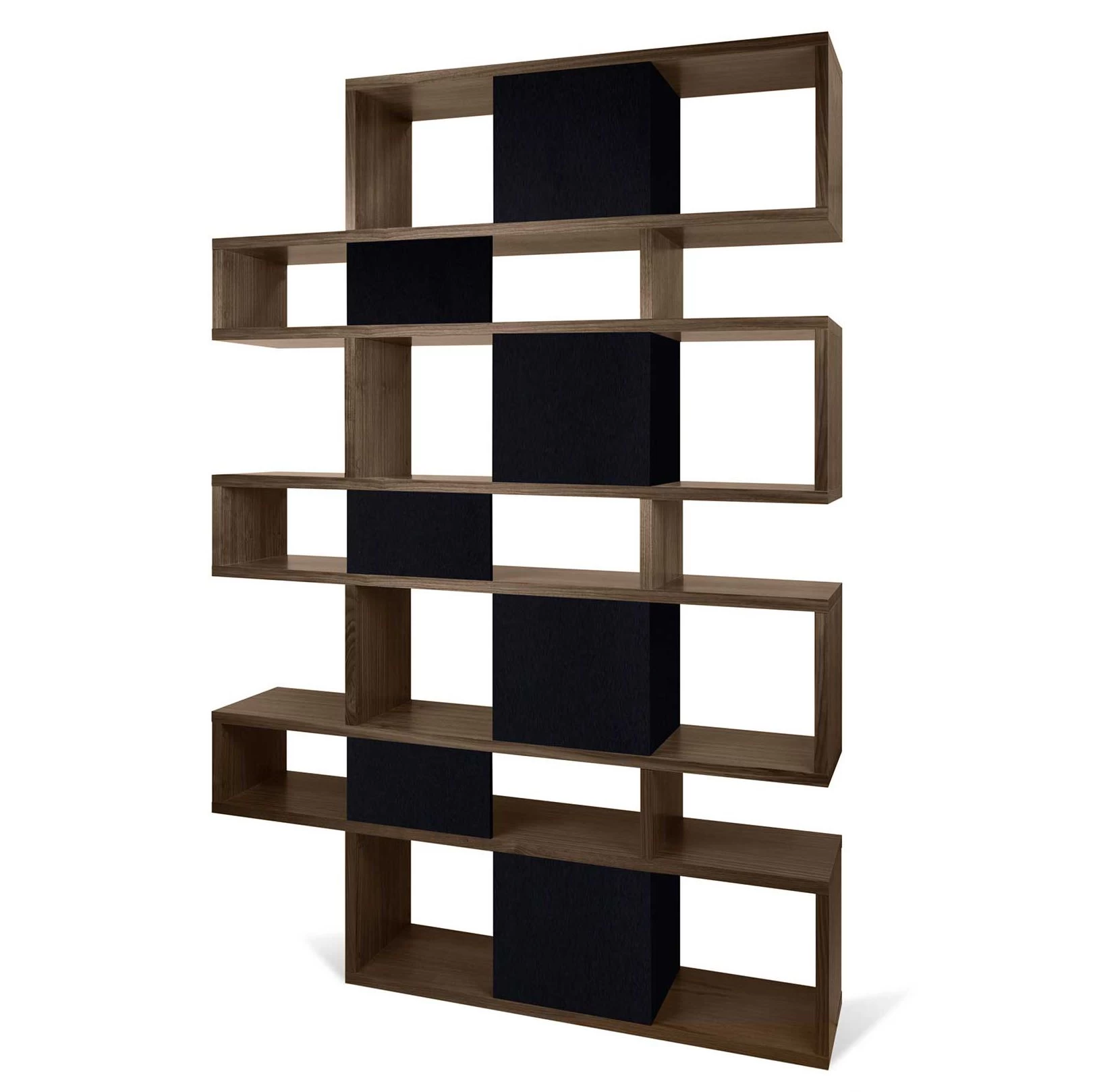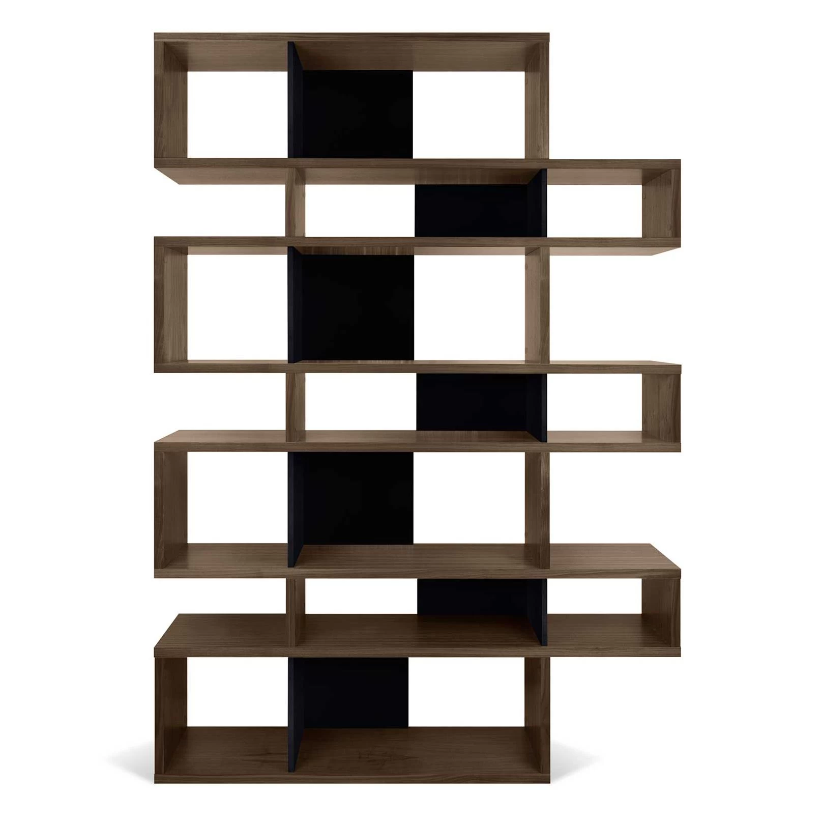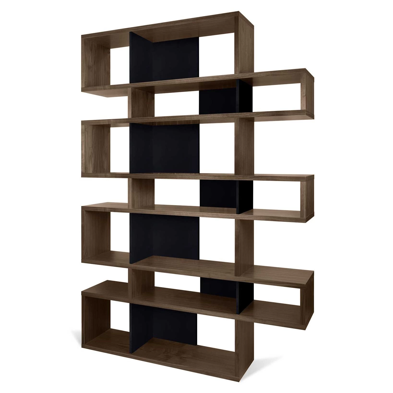 Réalisée en MDF, cette bibliothèque est dotée d’une finition en noyer. Certains compartiments sont pourvus d’un paroi de fond en noir mat. L’armoire est divisée en 7 niveaux. Chaque niveau est composé d’un grand et d’un petit compartiment.