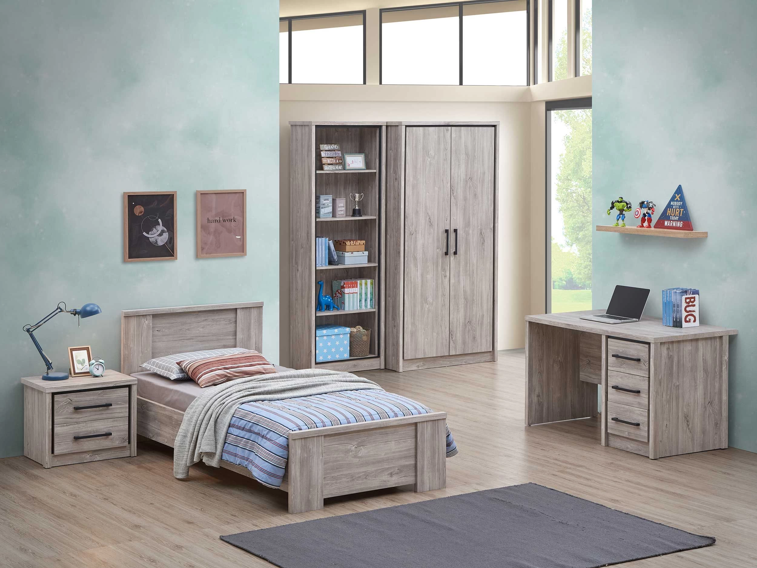 Décorez votre chambre avec les meubles Sela, une collection moderne qui instaurera une ambiance chaleureuse dans la chambre. Les meubles sont réalisés en panneaux de particules avec décor en chêne gris. Les lignes et les poignées noires apportent aux meubles un look épuré.