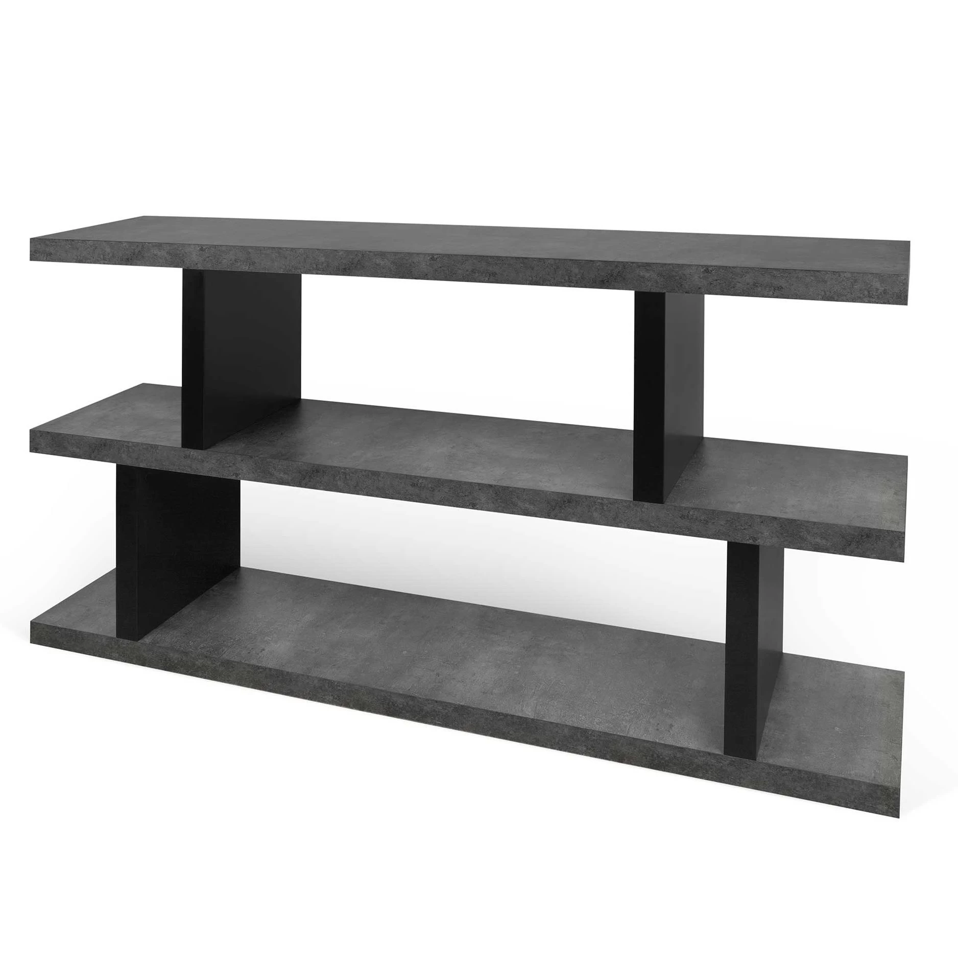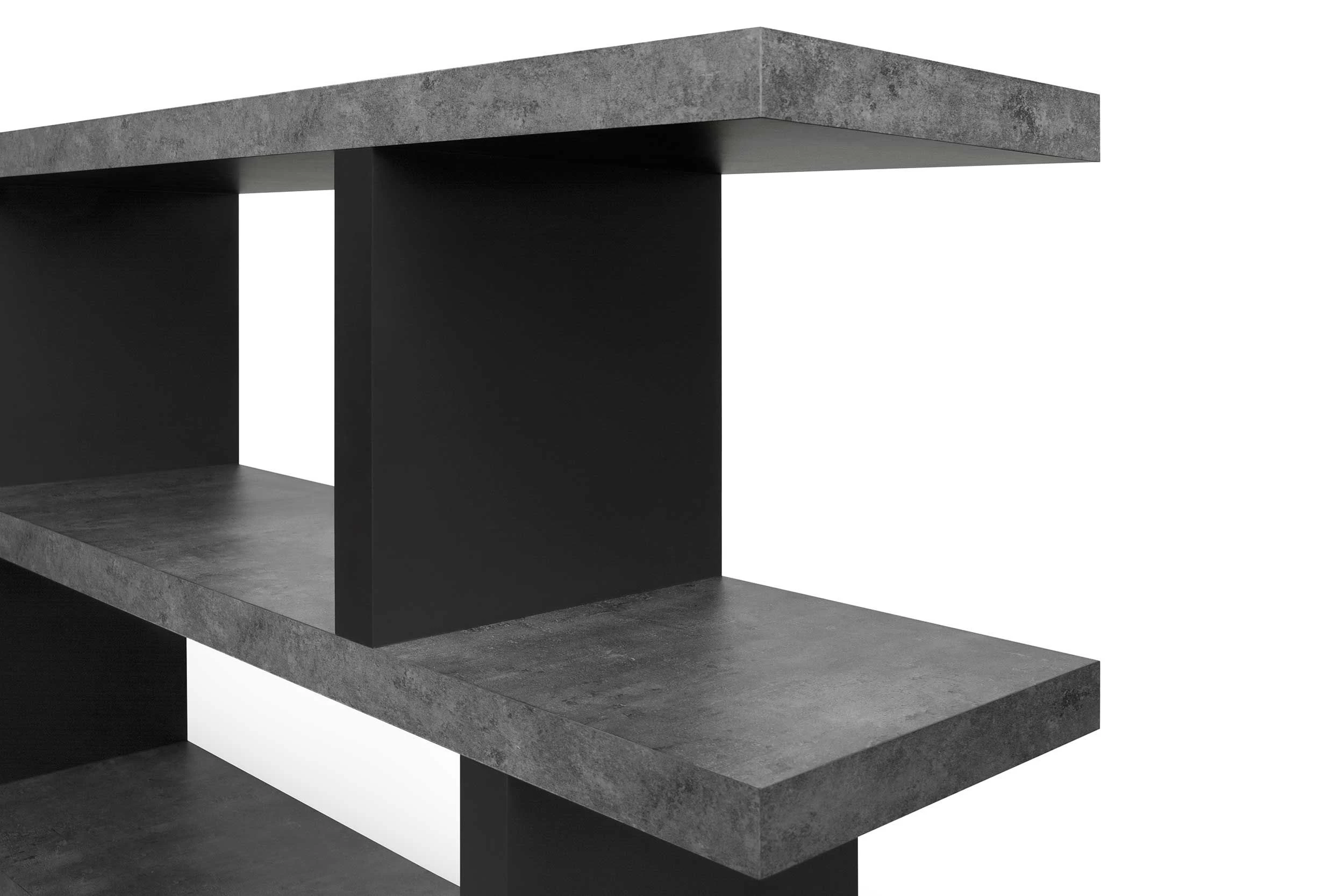 La bibliothèque Stephany deviendra la pièce de résistance dans votre intérieur. Elle est disponible dans une version basse et une version haute qui se combinent merveilleusement. Ce modèle bas mesure 88 cm de hauteur et compte 3 étagères, vous offrant assez de place pour arranger vos livres, décoration, cadres photo etc. Les séparations sont dotées d’une couleur noire moderne et les étagères ont une couche de mélamine à l’aspect béton. Les vis et les chevilles pour le montage mural ne sont pas incluses.