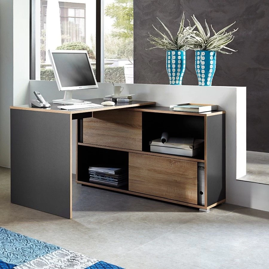 La gamme Tyson est idéale pour ceux qui ont besoin de changer de décor de temps en temps. Ce bureau d’angle est la combinaison parfaite de créativité, de design et de fonctionnalité. L’armoire intégrée comporte quatre étagères avec des portes coulissantes. Ce qui est chouette aux portes coulissantes, c’est qu’elles sont finies en décor chêne d’un côté et en anthracite de l’autre. Vous pouvez donc choisir quel côté vous voulez utiliser à l’extérieur, ce qui peut donner un effet ludique comme le montrent les photos.