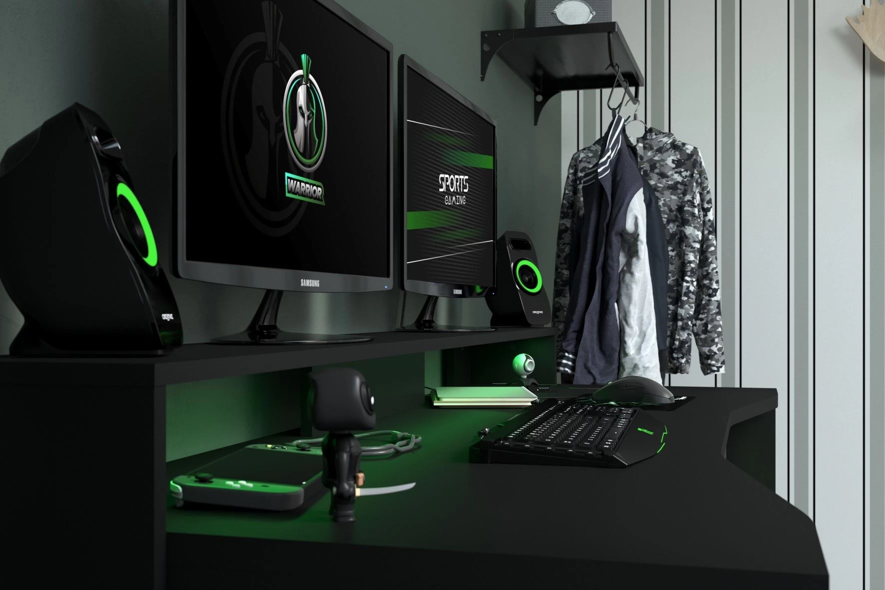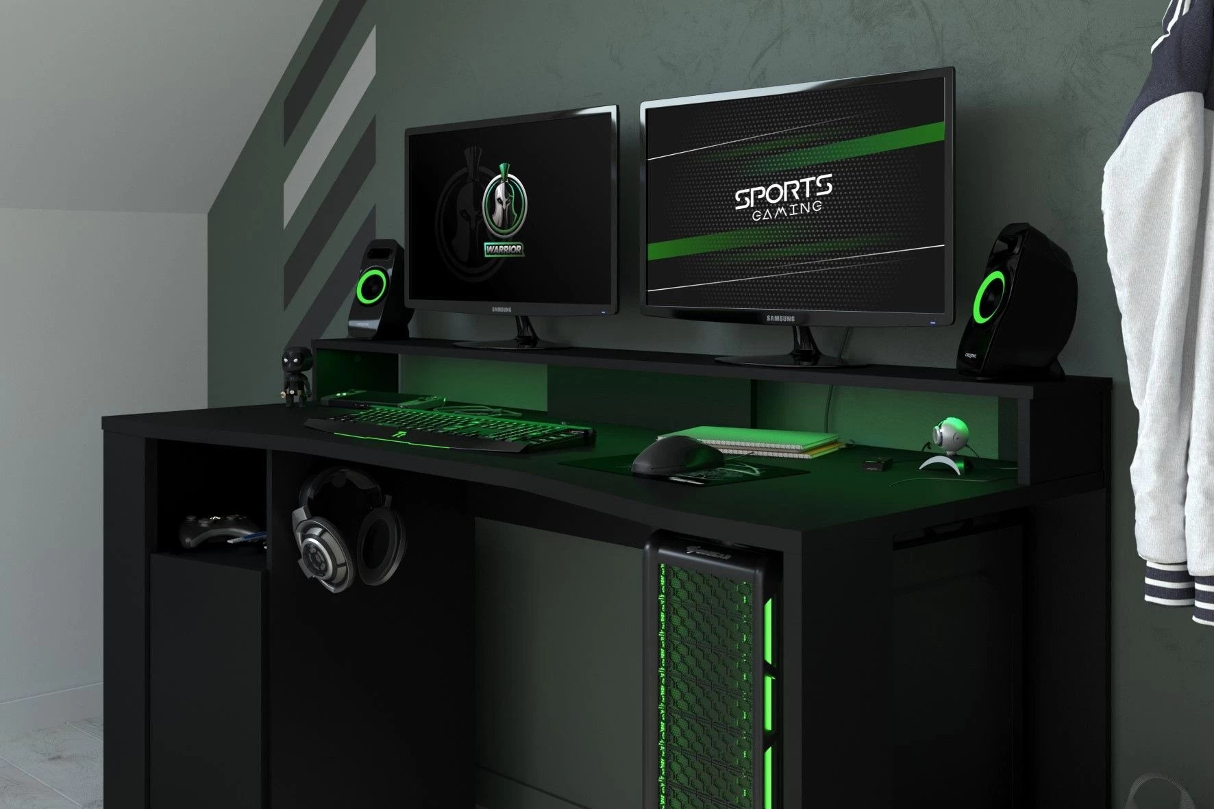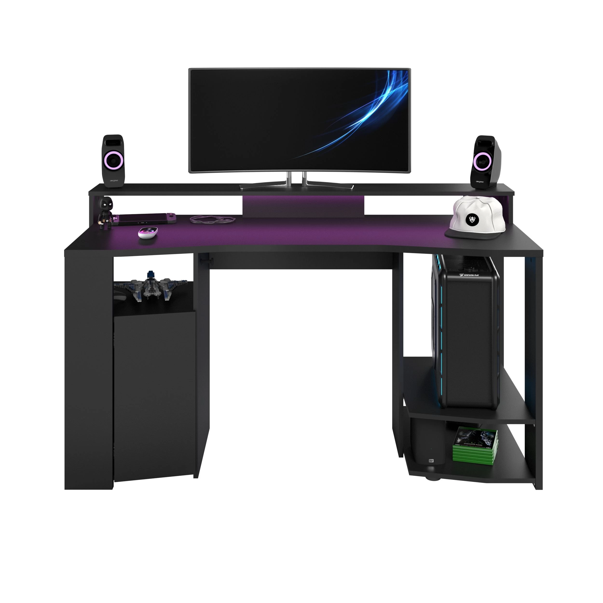 Ce bureau Gaming en aggloméré est fait à la mesure des fervents adeptes de jeux éléctroniques. Le meuble est équipé d’une plate-forme surélevée sur laquelle vous pouvez facilement placer 2 écrans, d’un espace de jeu spacieux (L152cm x L62), d’une bande LED sur toute la largeur et, sous la surface du bureau, d’un crochet pratique pour accrocher vos casque d’écoute. À droite, il y a deux étagères, dont la plus grande est idéale pour poser votre unité informatique. L’armoire à porte tournante située à gauche de l’unité comporte une autre étagère, ce qui vous offre de nombreuses possibilités de rangement. Un article innovant pour le gamer passionné !