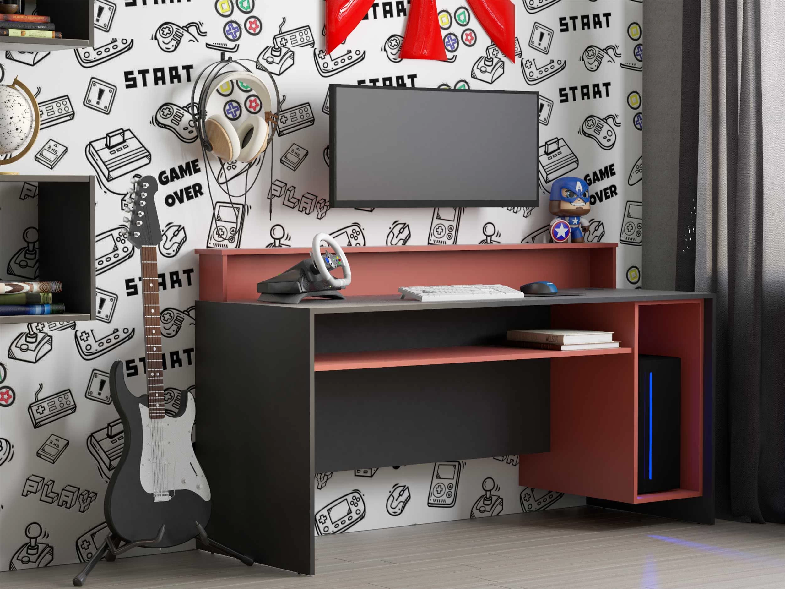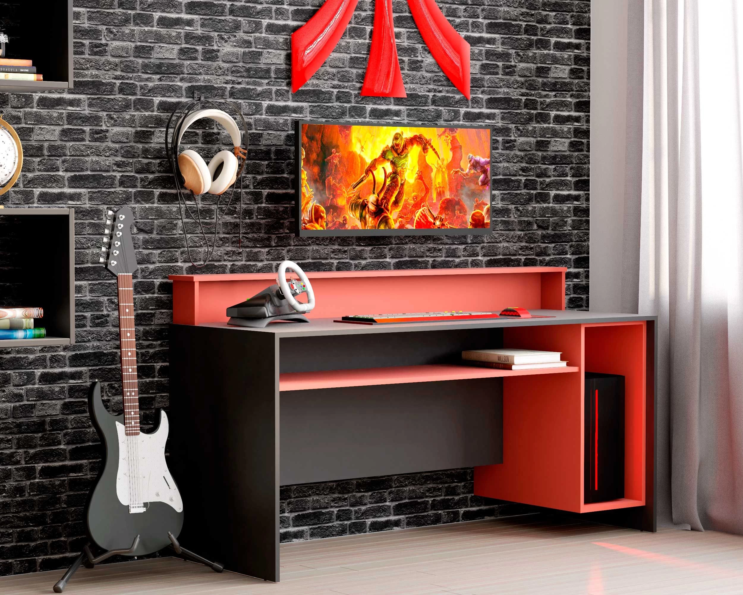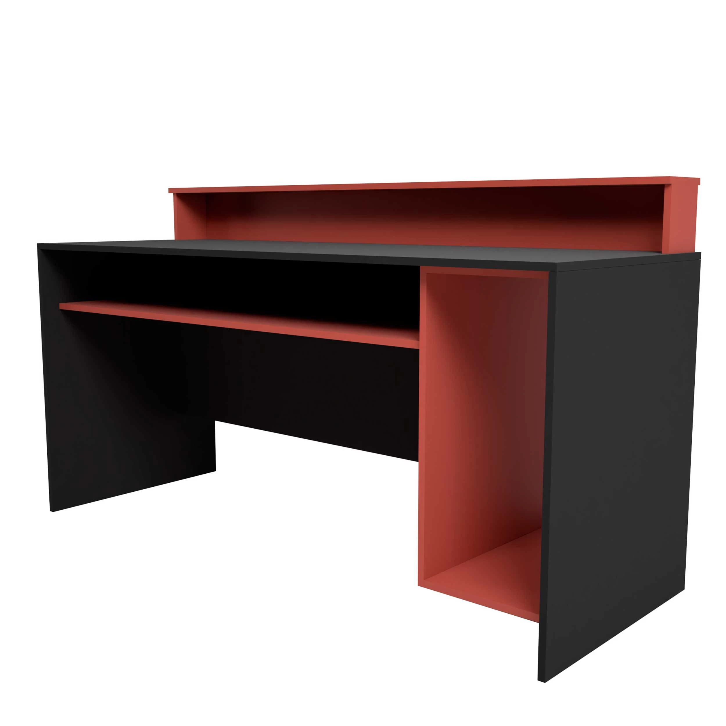 Le bureau de jeu Beri, d’une longueur de 140 cm, est spécialement conçu pour offrir un confort optimal pendant le jeu. Le bureau noir en aggloméré combiné aux compartiments rouges crée un look épuré. Il y a un compartiment pour l’unité informatique de 28 par 65 cm, qui est ouvert pour la ventilation. Sous le bureau il y a une étagère supplémentaire, tout comme il y a une autre étagère en haut pour vos écrans. Ainsi, vous pouvez ranger soigneusement votre matériel de jeu après avoir joué et utiliser votre bureau pour étudier, par exemple.