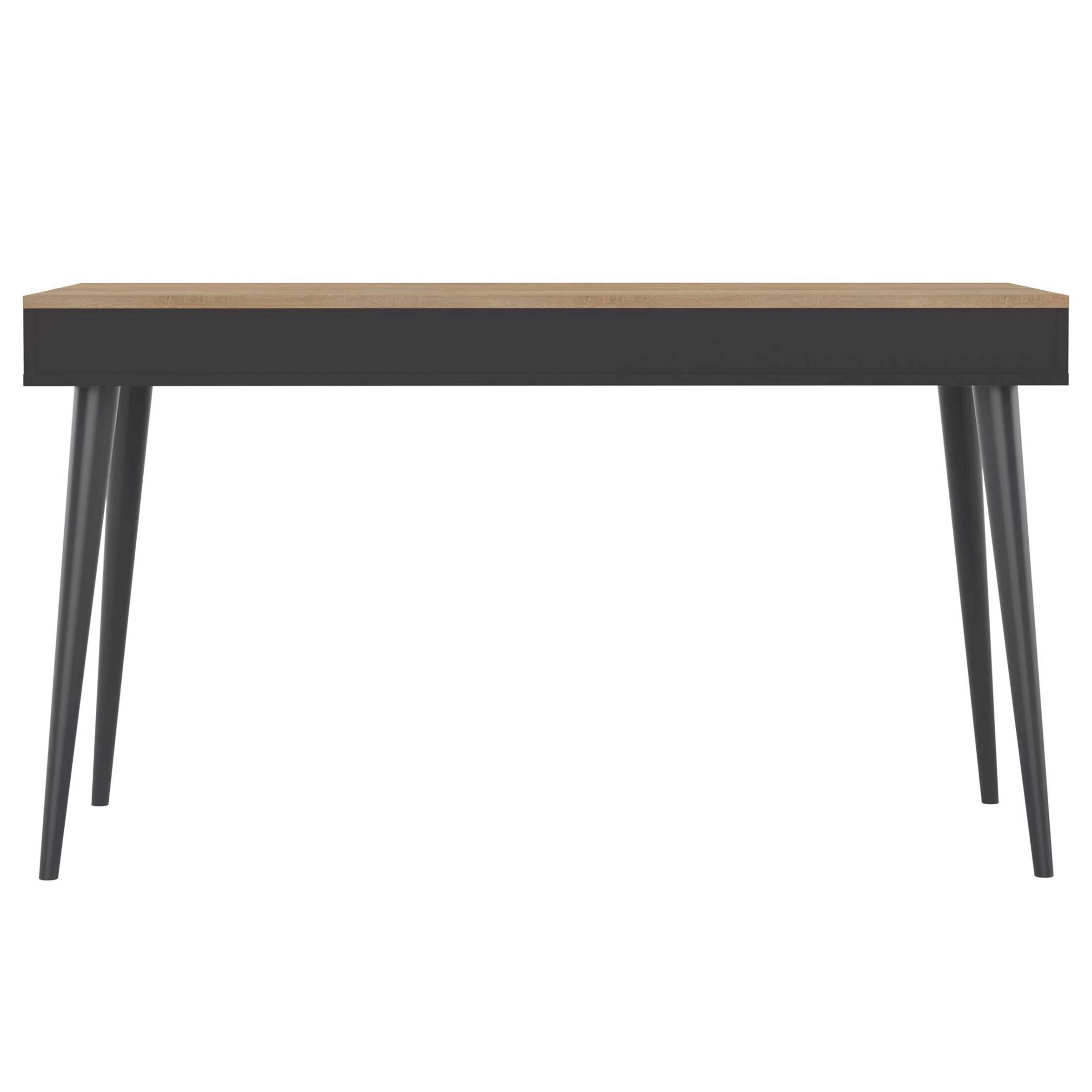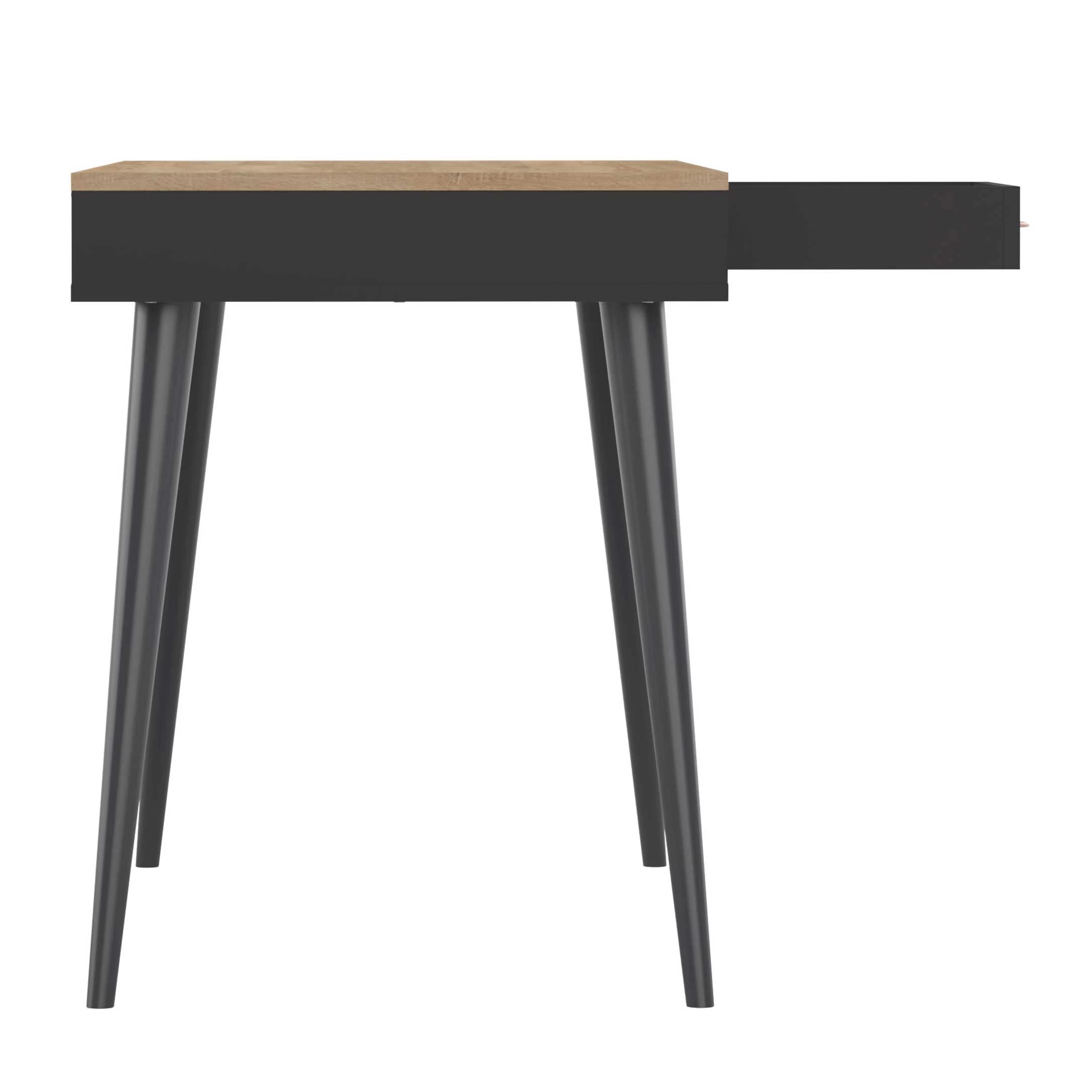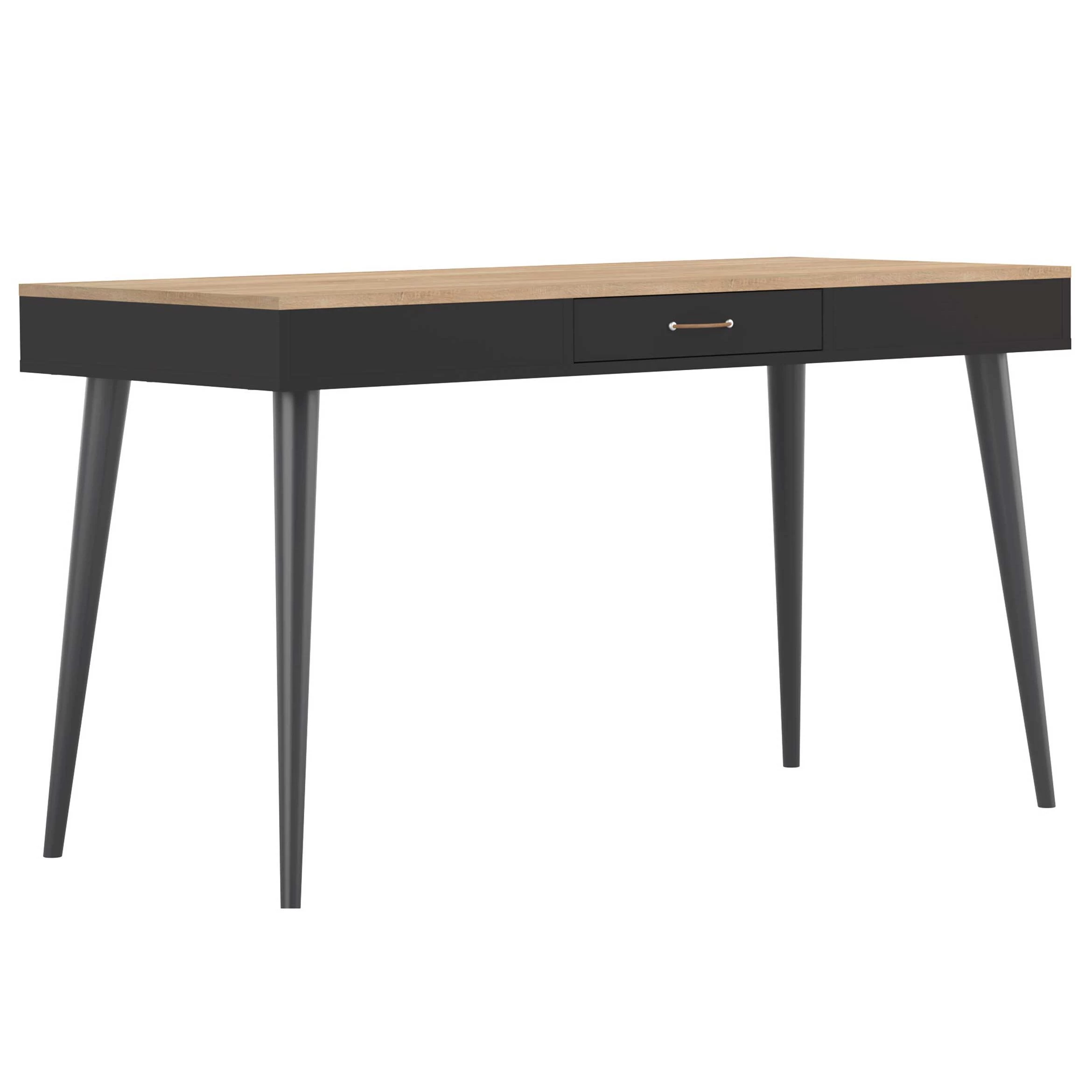 Egayez votre espace de travail avec ce joli bureau de la série Horizon. Le bureau a une couleur noire, ce qui se combine à merveille avec le décor en chêne du plateau de la table. Le bureau est fait d’aggloméré et possède des pieds coniques en bois massif (hêtre). Vous pouvez ouvrir le tiroir avec une fine poignée en cuir.