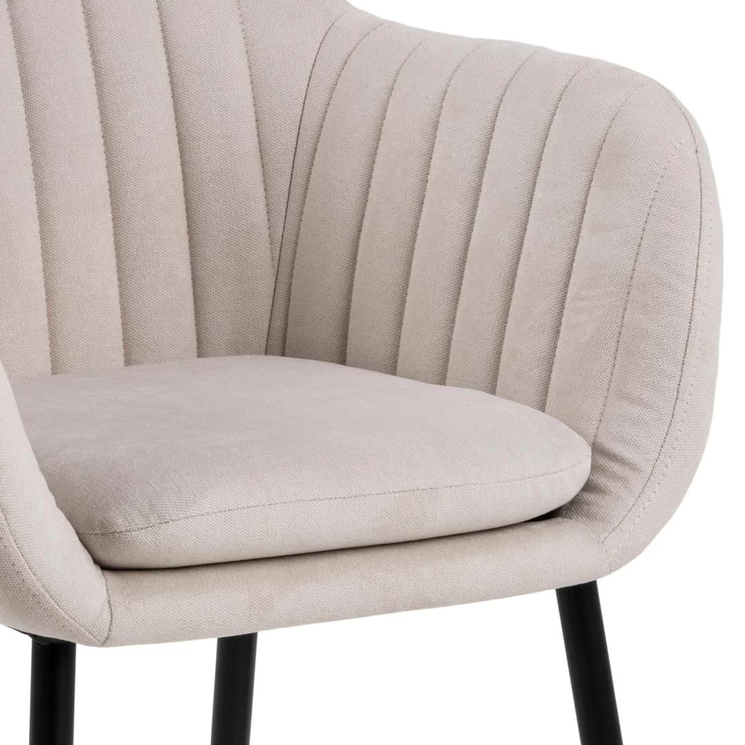 La chaise Hermeline avec accoudoirs est recouverte d’un tissu de couleur sable et décorée de coutures verticales. La chaise dispose d’un coussin confortable et possède des pieds noir mat en métal. Avec cette chaise luxueuse à votre table, vous apportez assurément du cachet à votre salle à manger !