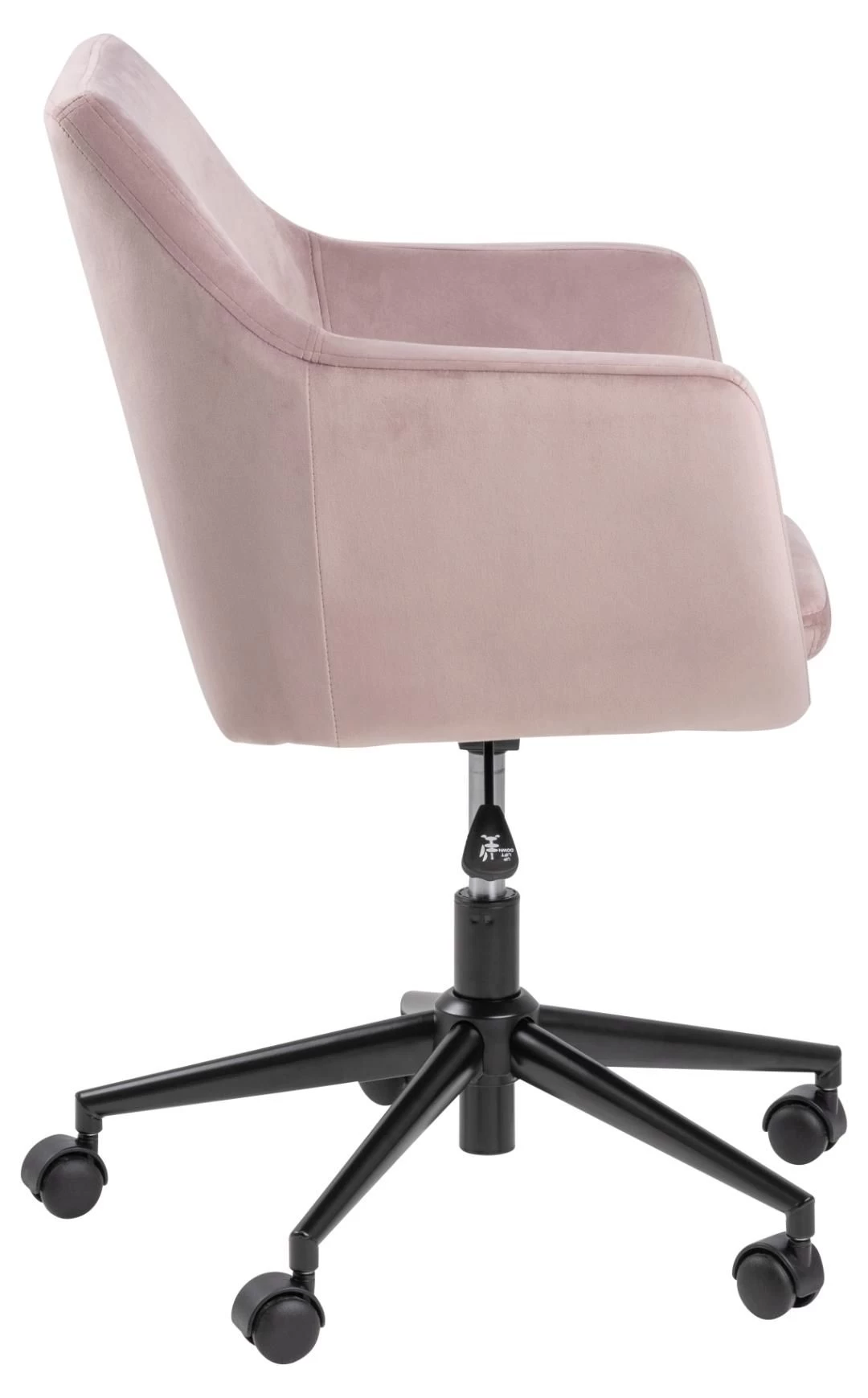 La chaise de bureau Noria est fabriquée en métal, avec un revêtement en tissu VIC rose clair. Elle a une hauteur d’assise de 44 cm à 54 cm, une largeur d’assise de 39 cm et une profondeur d’assise de 41 cm.