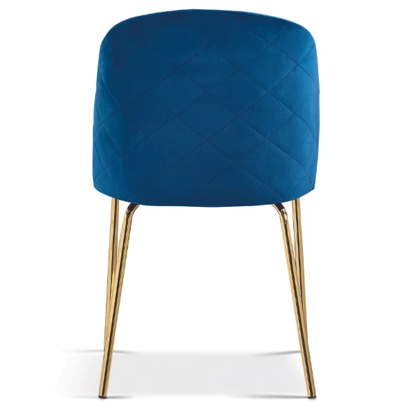 Chaise de salle à manger Lucinda a un look luxueux avec son revêtement en velours bleu foncé et ses pieds en métal de couleur or. Le dossier rond avec motif de diamant à l’arrière donnent au même temps un caractère ludique au meuble. Aussi disponible en d’autres couleurs.