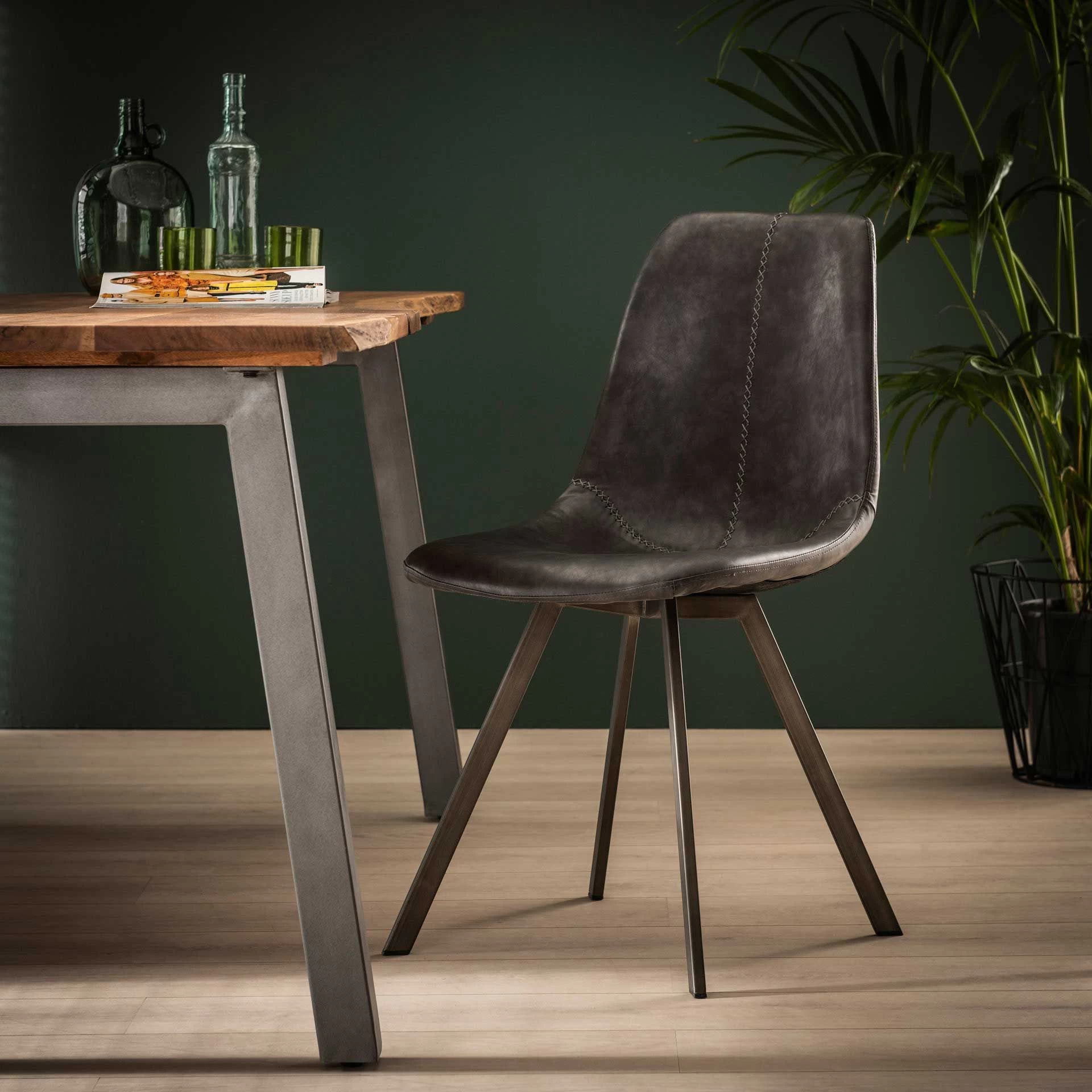 La chaise Zigi est revêtue de similicuir noir et est décorée de coutures. Cette chaise coquille robuste repose sur quatre pieds obliques en métal.