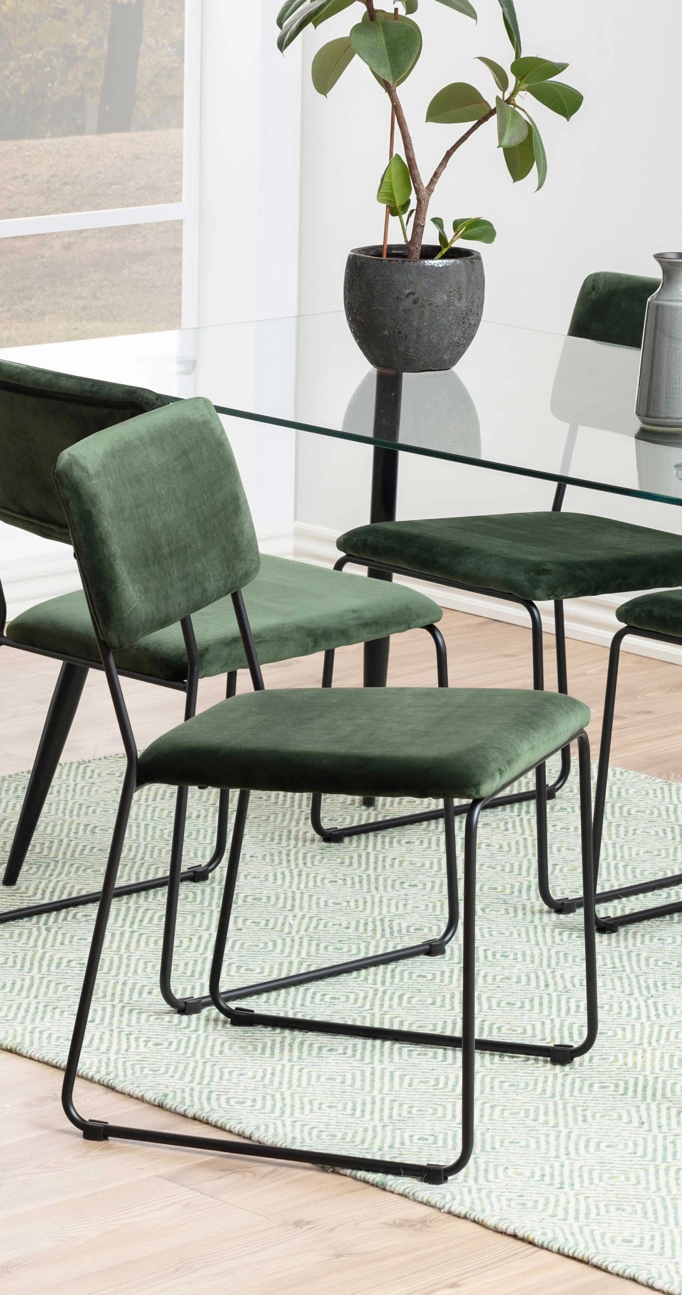 Cette chaise Nelly aux pieds noir mat en métal s’intègre sans effort dans tout intérieur moderne. Le revêtement de la chaise en velours vert forêt ajoute de la couleur et aussi de la classe à votre salle à manger.