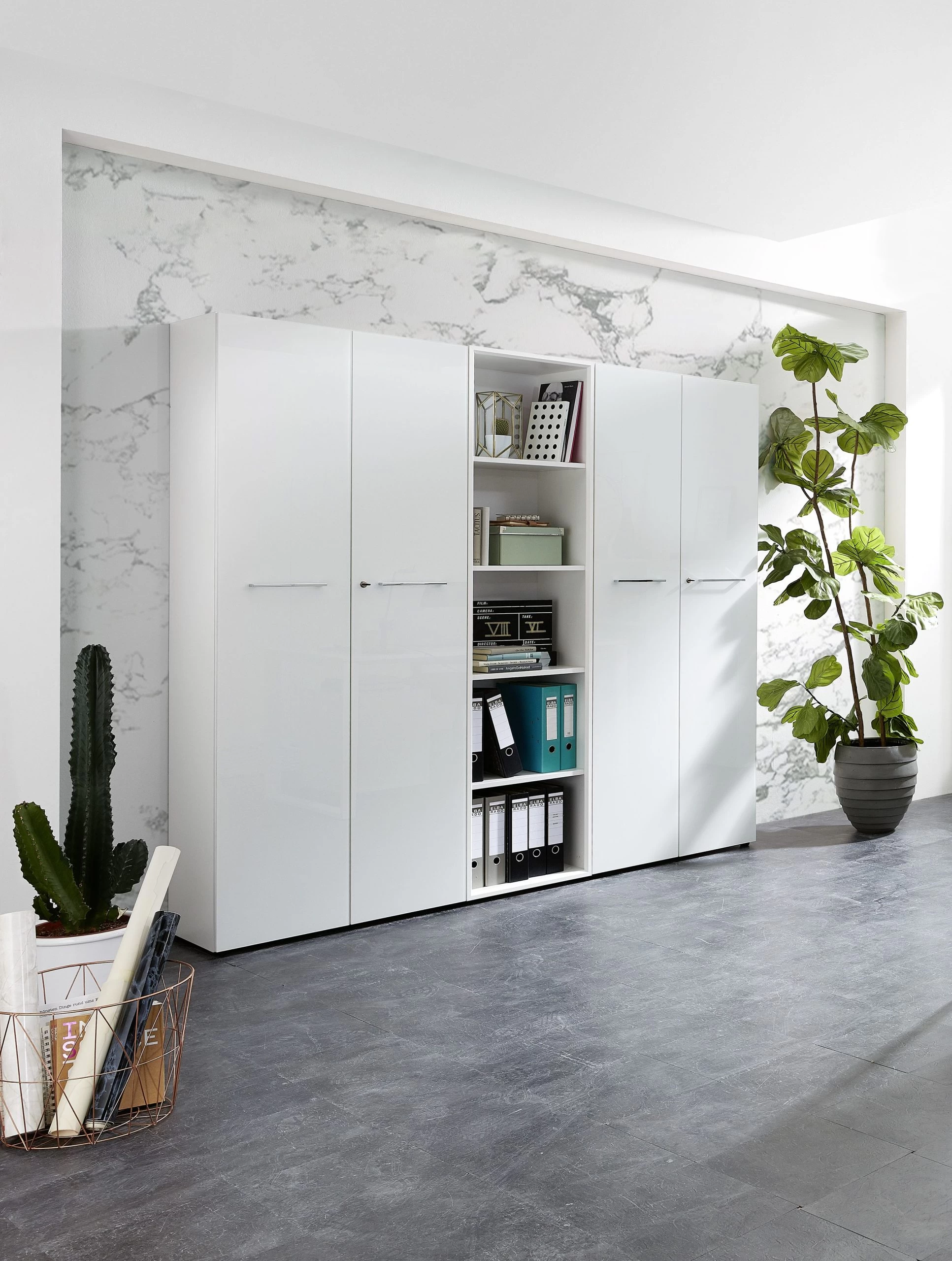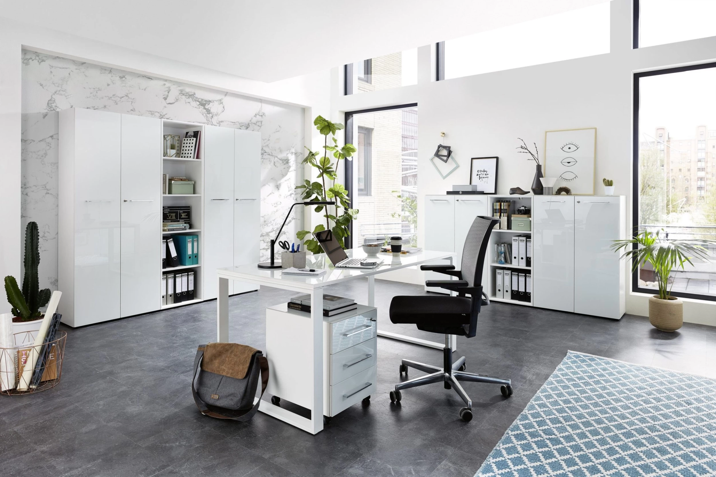 bureau (à domicile) avec les meubles de la série Mouna. La couleur blanche des
