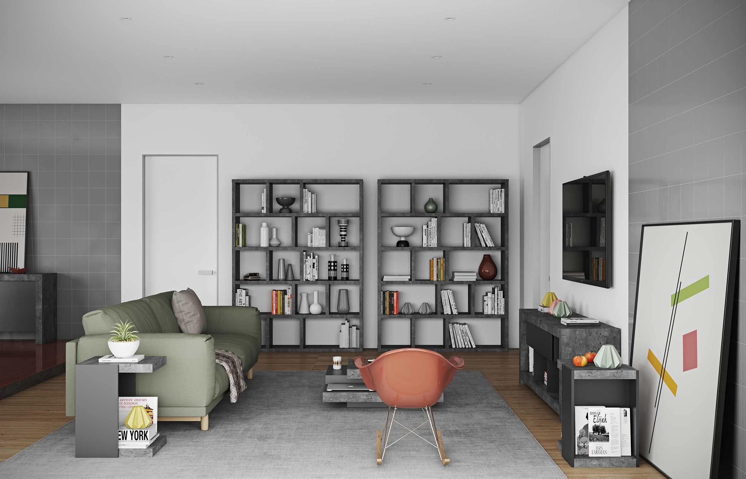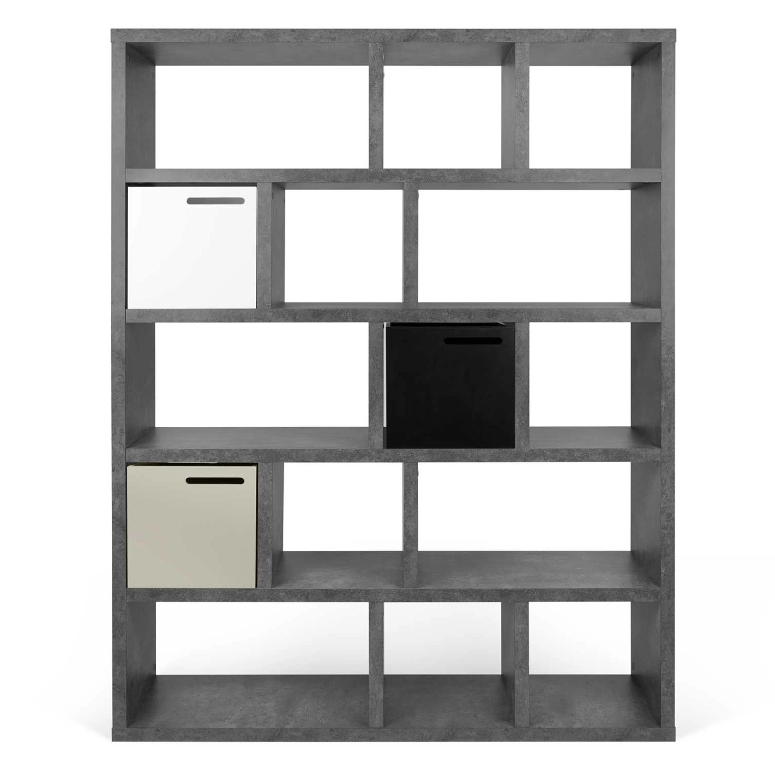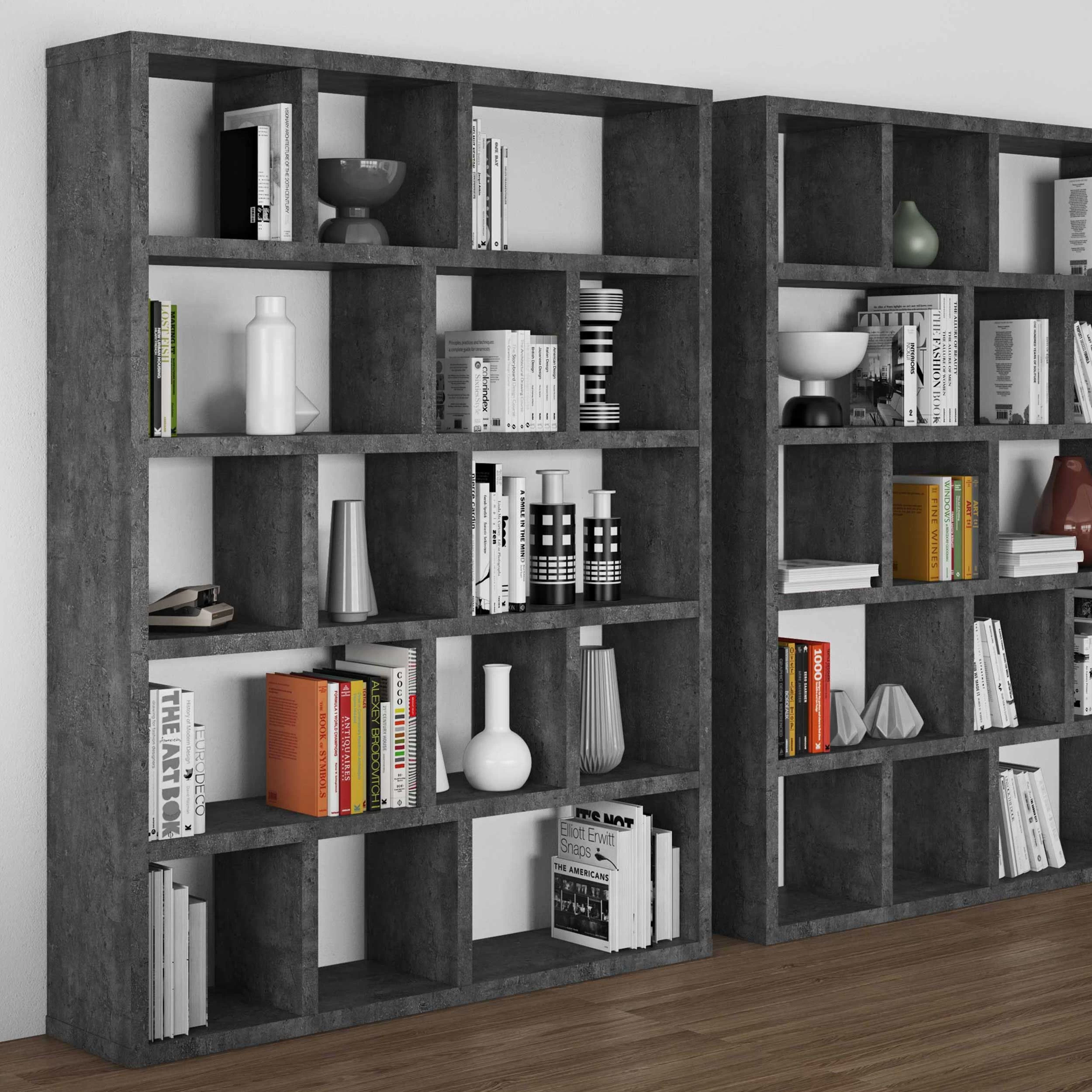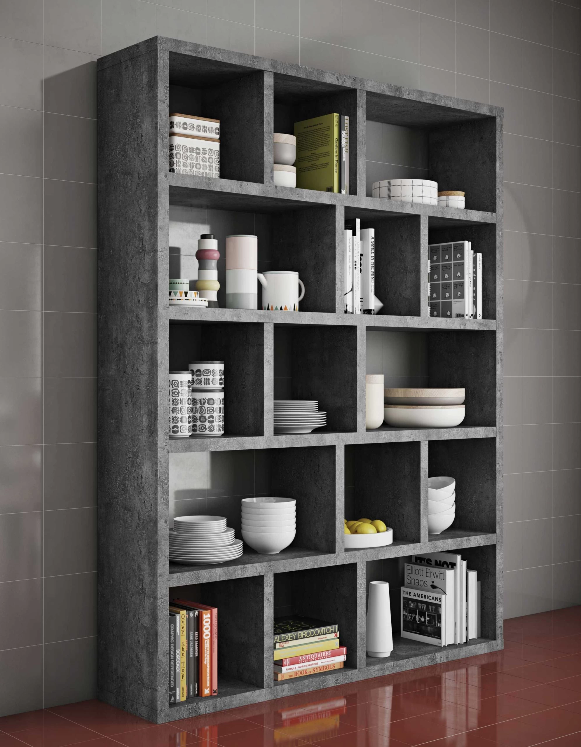 L’étagère Berkeley se caractérise par son design atypique et surtout par son compartimentage géométrique. Grâce à son décor béton, cette étagère s’harmonise à merveille avec l’ameublement de votre séjour ou bureau. Les 5 tablettes sont divisées en compartiments de différentes tailles et vous offrent assez de place pour ranger vos livres et autres objets.