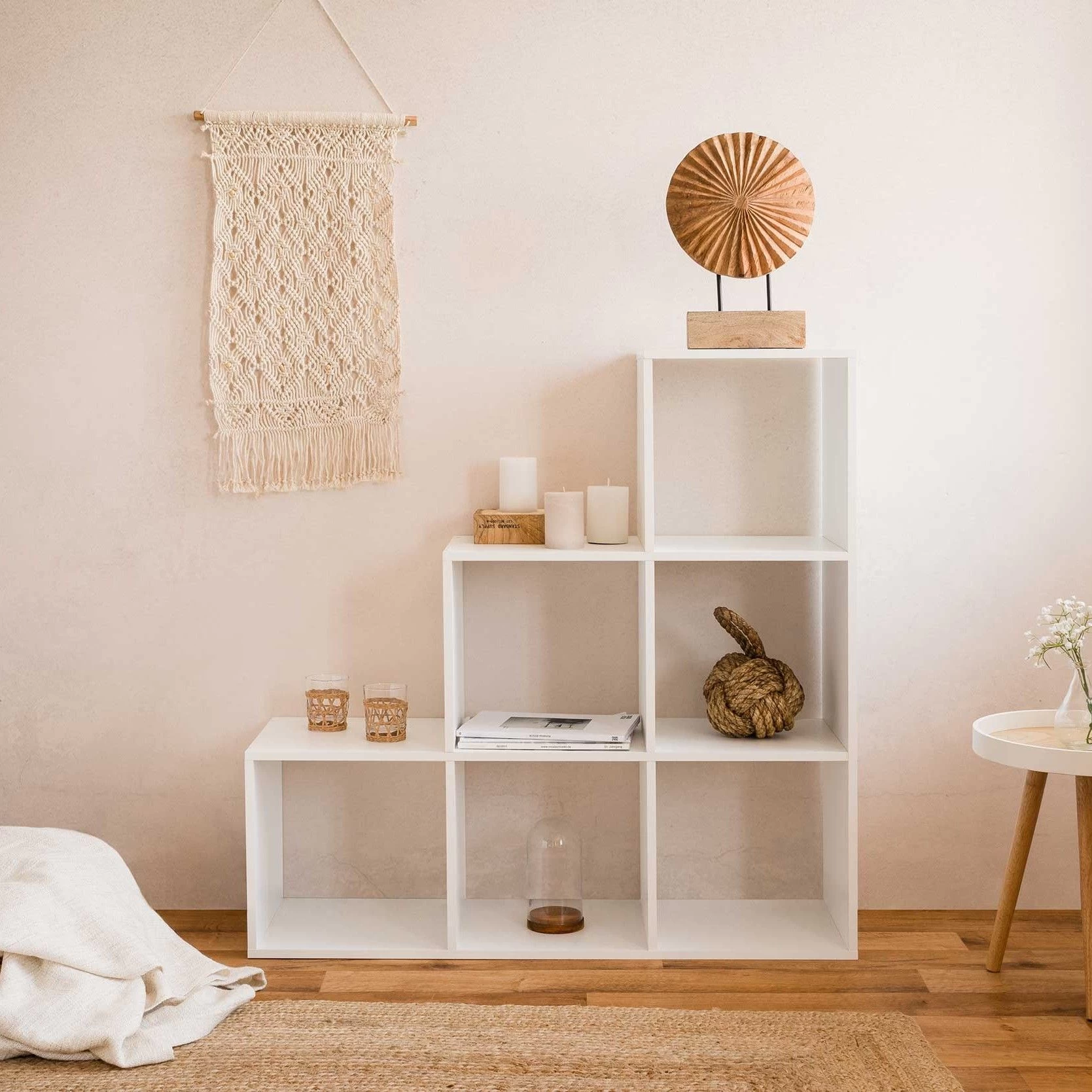 Cette attrayante étagère de rangement Udine en aggloméré blanc se caractérise par son design ludique et ses vastes possibilités. Dans les 6 compartiments ouverts, vous pouvez utiliser des décorations, des accessoires et des paniers de rangement pour habiller la pièce.