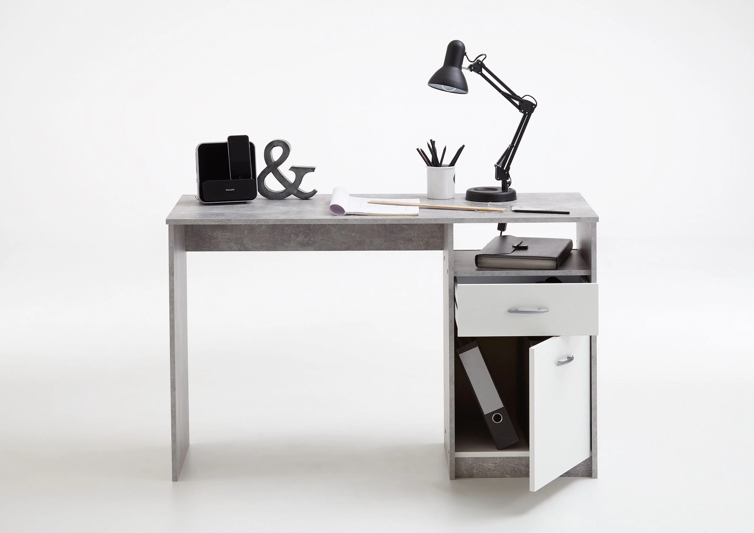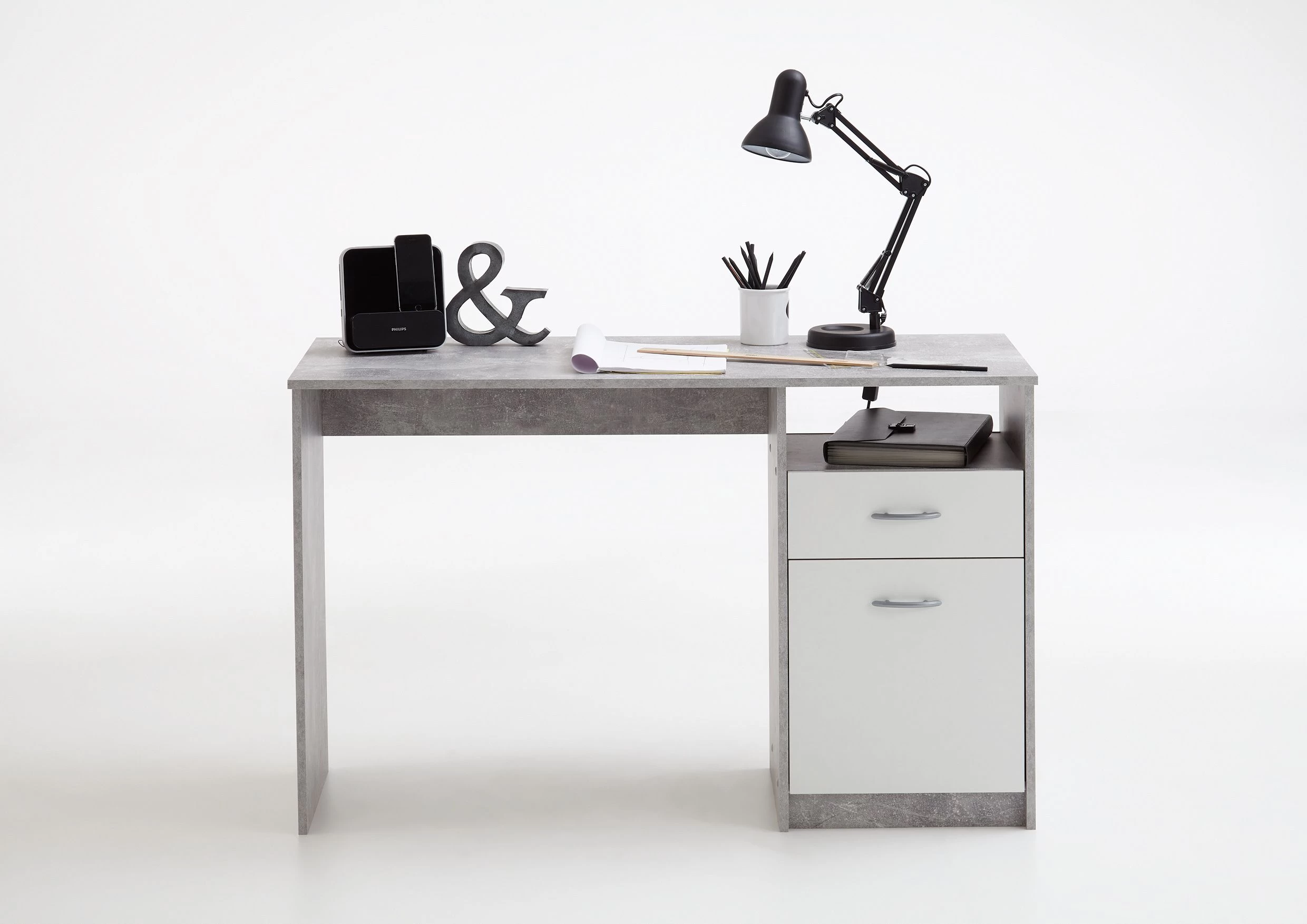 La déco de votre bureau mérite également de l’attention. En effet, il est très important que vous vous y sentiez bien et que vous y puissiez travailler en tout confort. Le bureau Jady dispose d’un design moderne avec un beau contraste entre le blanc et l’effet béton. Le meuble est équipé d’un tiroir pratique et d’une armoire pour ranger toutes vos affaires. Le bureau est fait de panneaux de particules.
