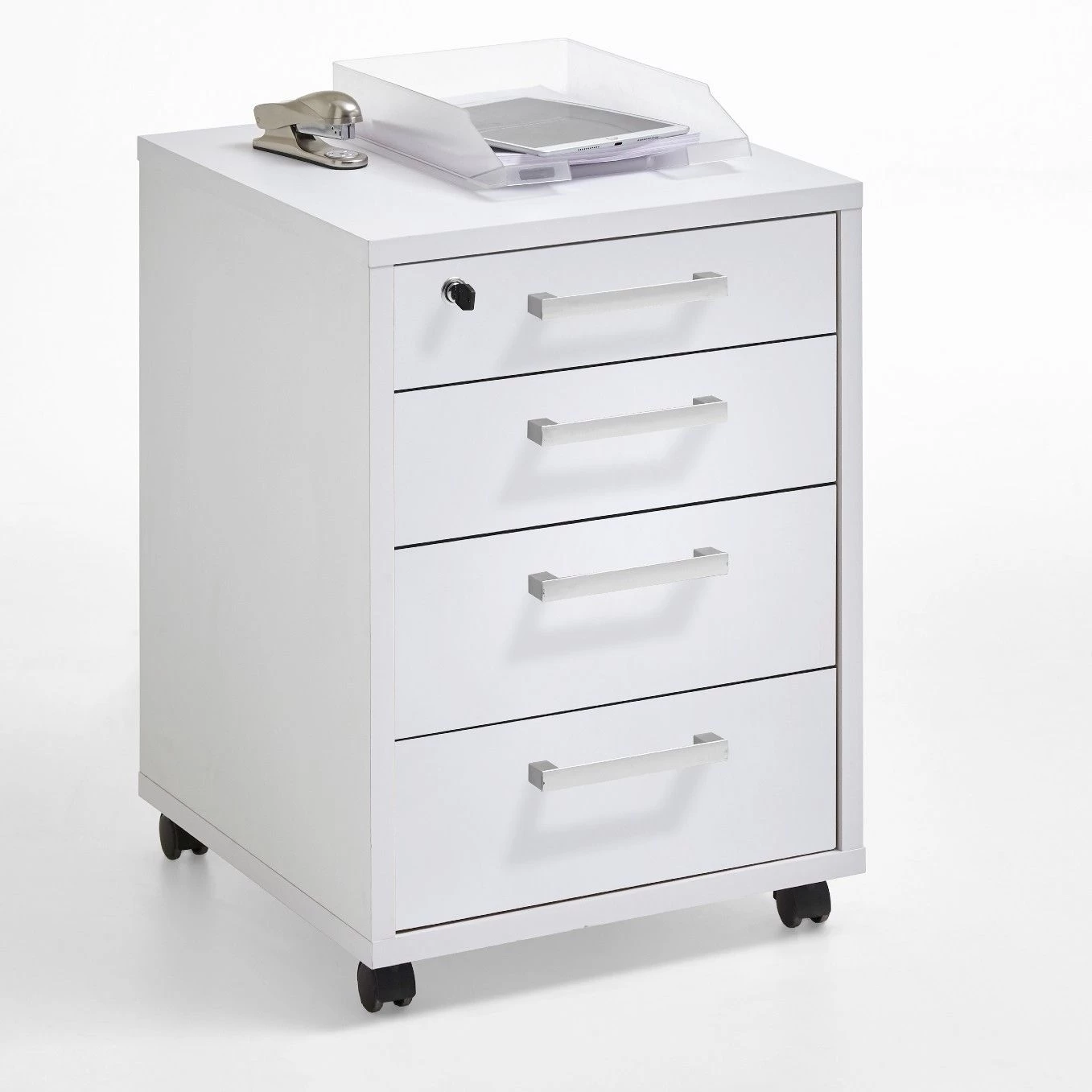 Ce petit meuble stylé est indispensable dans votre coin travail ! Le caisson Gabi est réalisé en panneaux de particules à finition blanc brillant. Il comprend 4 tiroirs utiles afin de ranger tous vos articles de bureau. Grâce aux roulettes, il se déplace facilement. Vous pouvez combiner le caisson avec les meubles assortis de la collection Gabi, mais son look neutre colle tout aussi bien avec d’autres meubles.