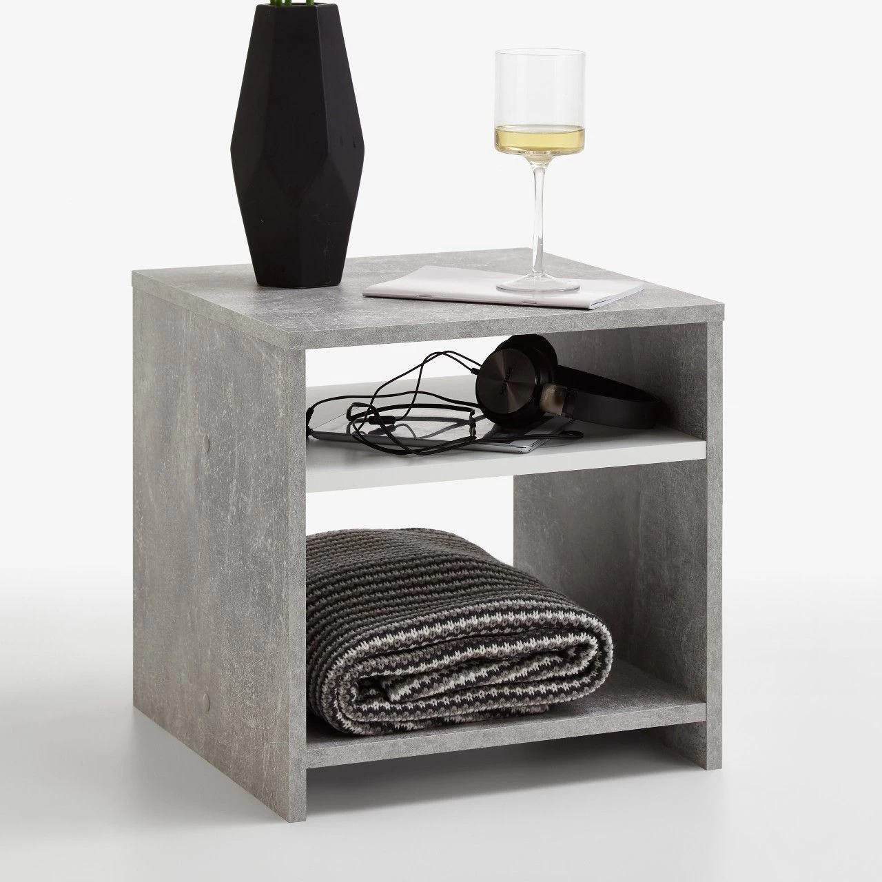 Laissez-vous surprendre par cette table d’appoint pratique au look industriel ! Malgré ses petites dimensions, elle vous offre de nombreuses possibilités de rangement. La table comprend 2 étagères. L’étagàre supérieure est de couleur blanche, créant un joli contraste avec l’effet béton. Le meuble est réalisé en panneaux de particules.