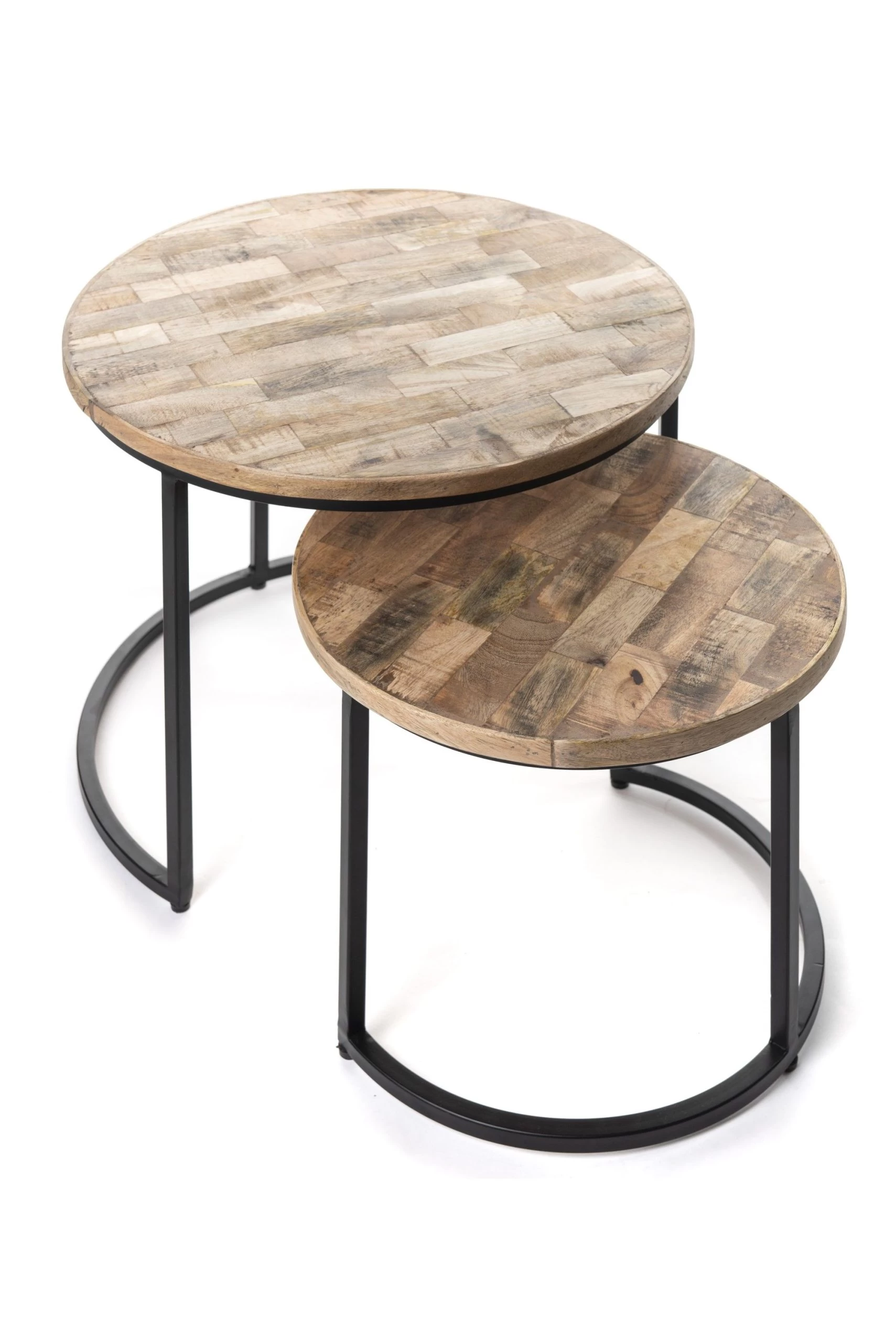 Ces 2 tables gigognes rondes enrichiront votre intérieur. Faciles à déplacer, elles s’utilisent ensemble comme table basse, par exemple, mais aussi individuellement. Les plateaux sont composés de bandes de bois. Ils contrastent joliment avec le piètement semi-rond en métal.