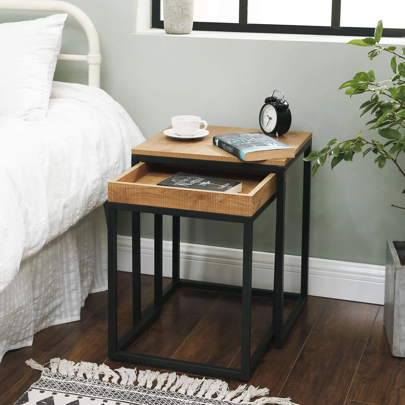 Ce set de tables d’appoint comprend 2 tables avec un plateau en panneaux de particules brun miel et avec un cadre robuste en métal. Utilisez les tables gigognes comme table basse ou placez une table à côté de votre fauteuil pour y poser votre carnet et un stylo.