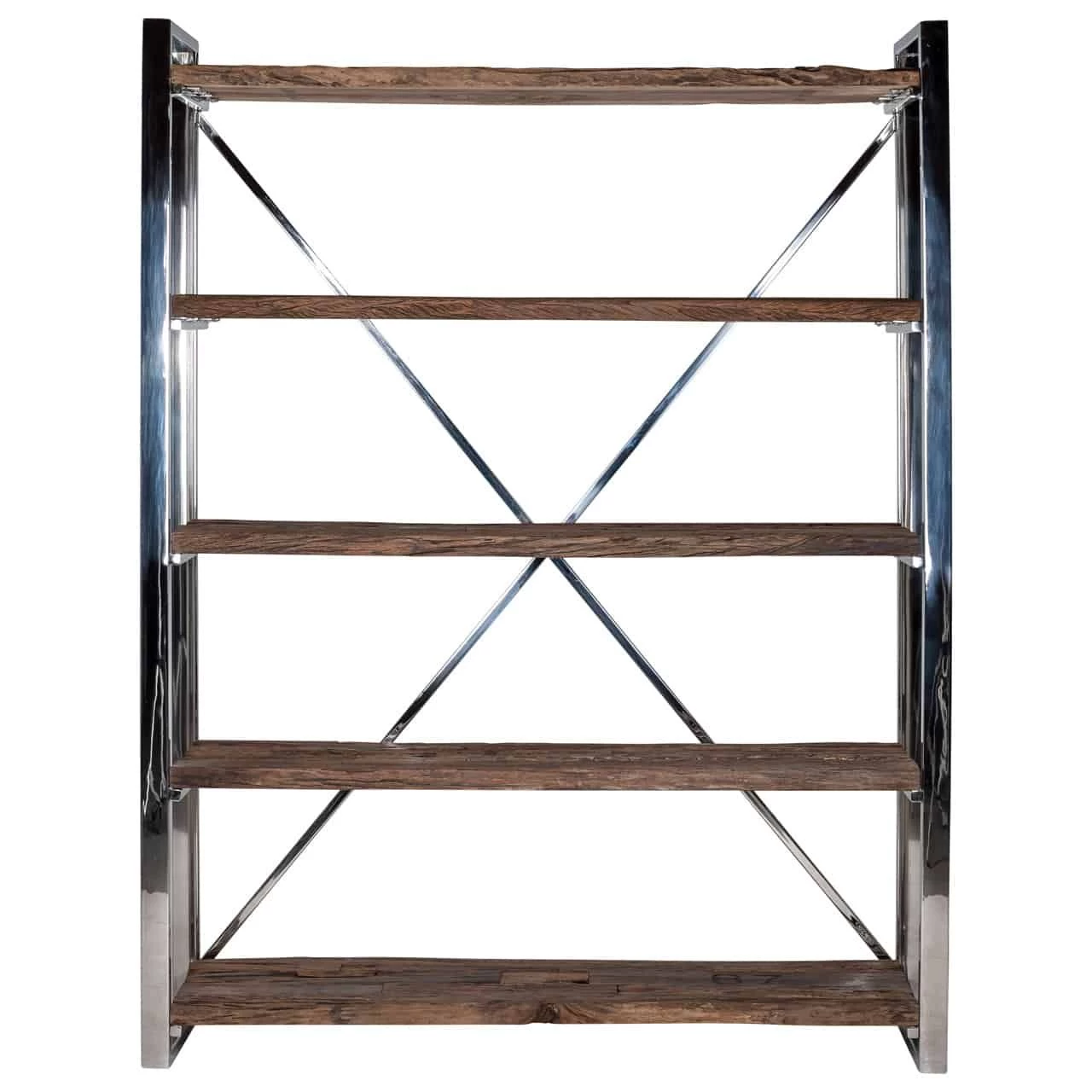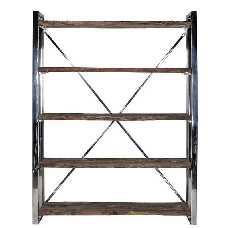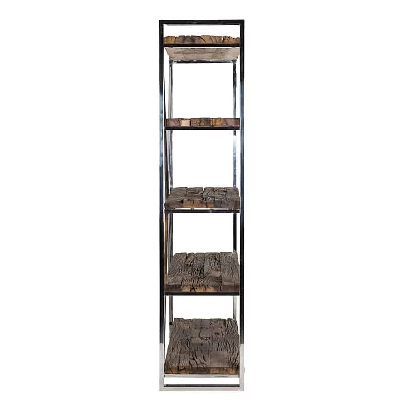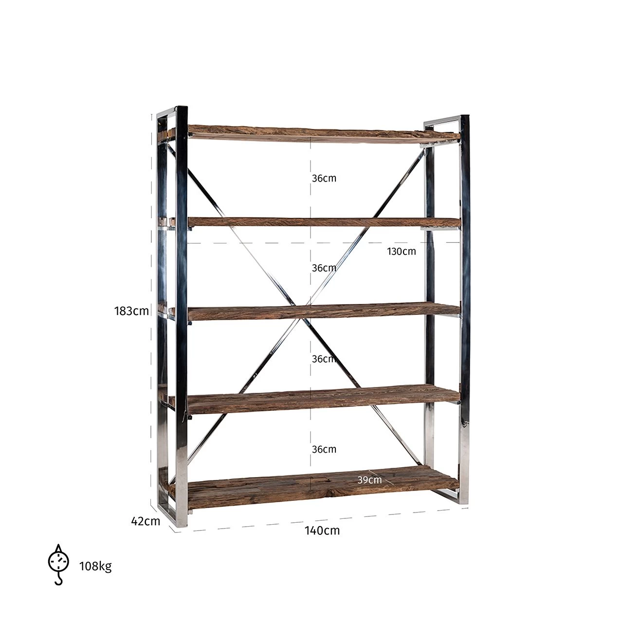 Bibliothèque Kensington avec 5 étagères se montre un vrai accroche-regard dans votre salon. Ce meuble est donc la solution parfaite pour vos accessoires ou votre décoration de petite et moyenne taille. Le meuble fait partie de la vaste collection Kensington “Shiny”, qui allie une apparence robuste à une touche d’élégance. Le cadre en acier inoxydable argenté et brillant, associé au bois recyclé brut, donne au meuble un aspect tendance mais robuste. Découvrez également le reste de cette gamme sur notre site web.