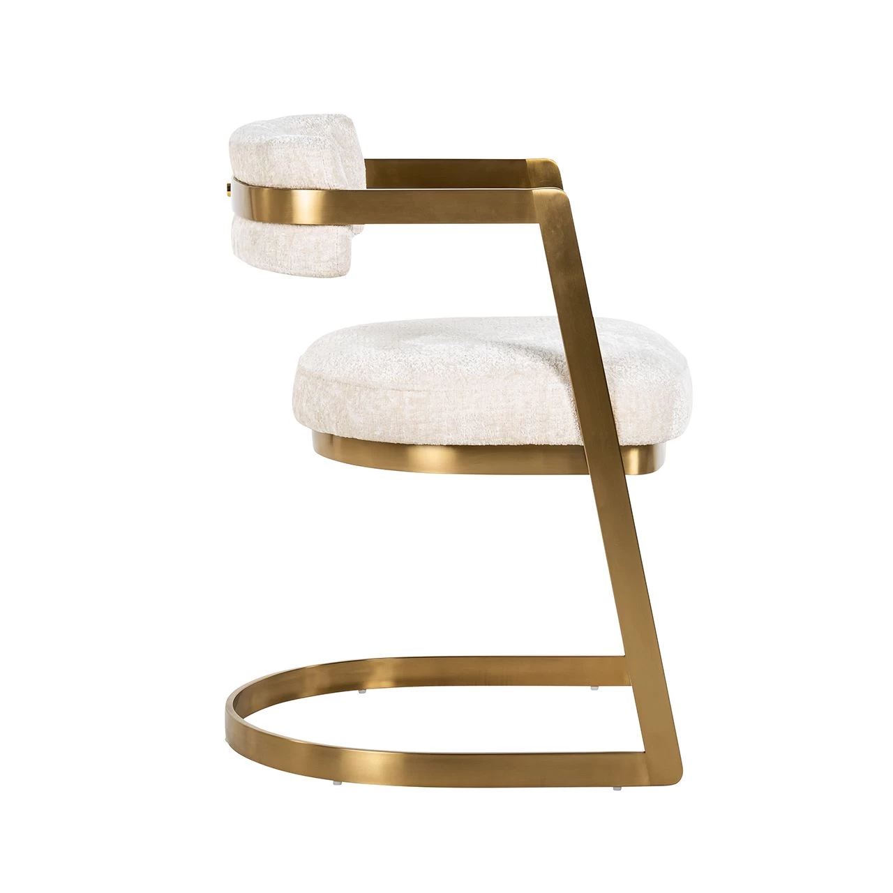 L’élégante chaise cantilever Jardo crée une atmosphère autour de la table à manger. Outre l’assise, le dossier est également revêtu d’un tissu en chenille de 100% polyester et rempli de mousse pour un confort d’assise optimal. Le pied du traîneau est en métal doré, tout comme l’accoudoir. Le siège est également soutenu par une telle surface métallique, qui apporte non seulement la robustesse nécessaire mais aussi un aspect luxueux. Outre le tissu chenille blanc, cette chaise est aussi disponible en velours kaki.