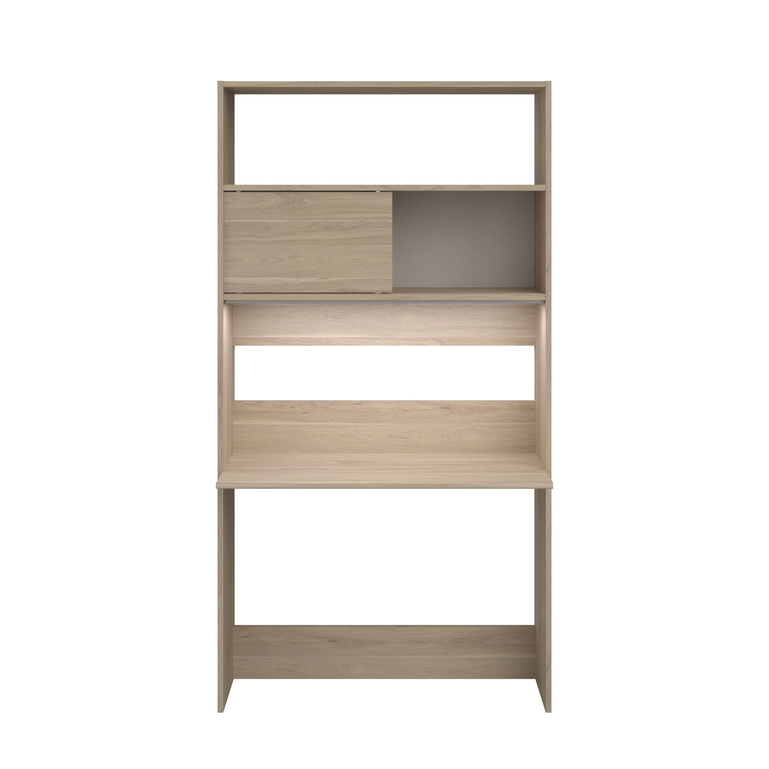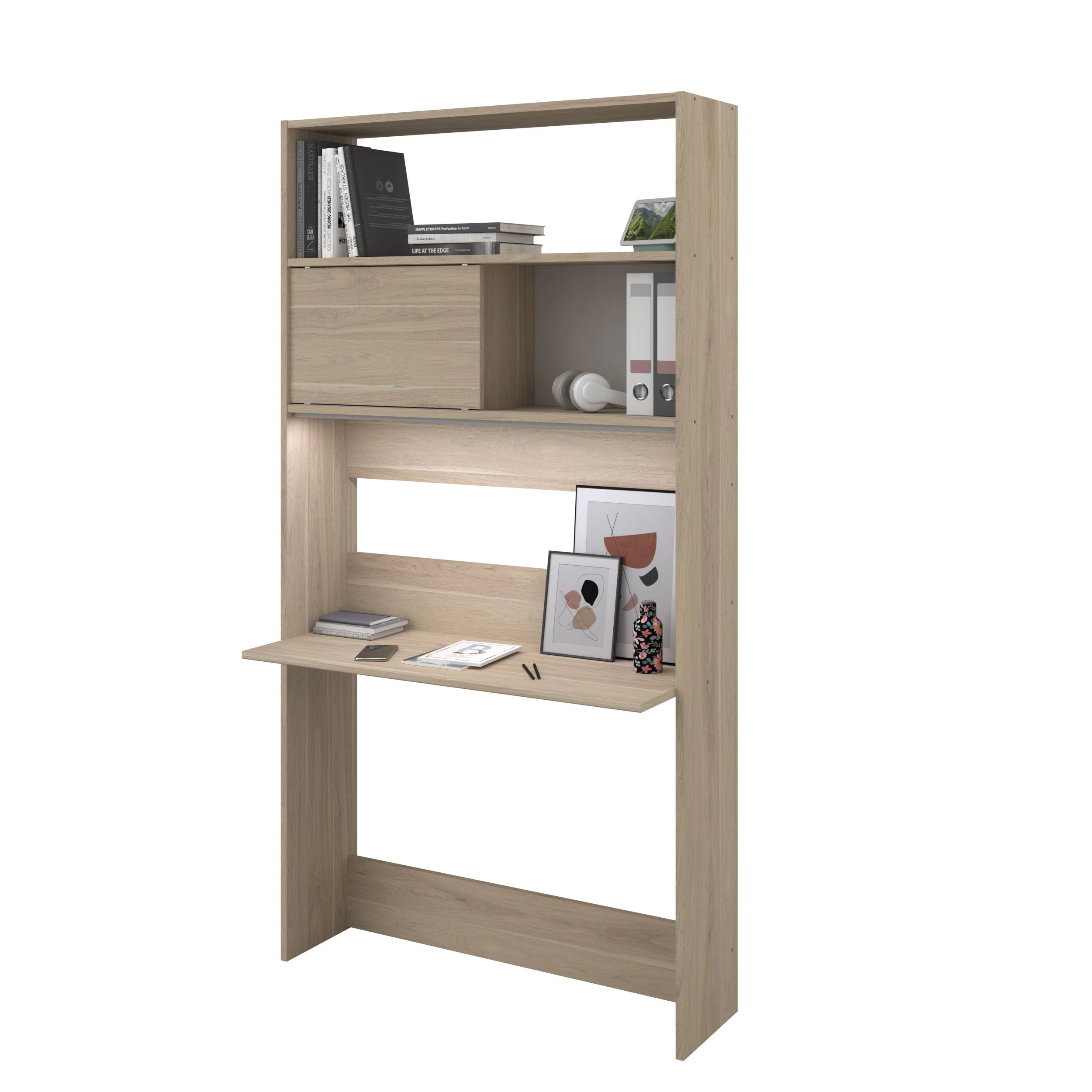Ce sécretaire est le meuble idéal pour les espaces de travail ou de vie à espace limité. L’armoire mesure 105 cm de large, 198 cm de haut et 44 cm de profondeur. Tout en haut, vous trouverez un compartiment ouvert. En dessous, il y a un compartiment avec une porte coulissante qui vous permet de protéger vos affaires. Enfin, il y a un atelier avec un plan de travail qui est entièrement éclairé par un éclairage LED. Découvrez ce modèle également en blanc ou décor de noyer !
