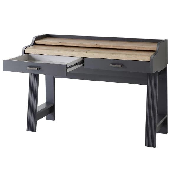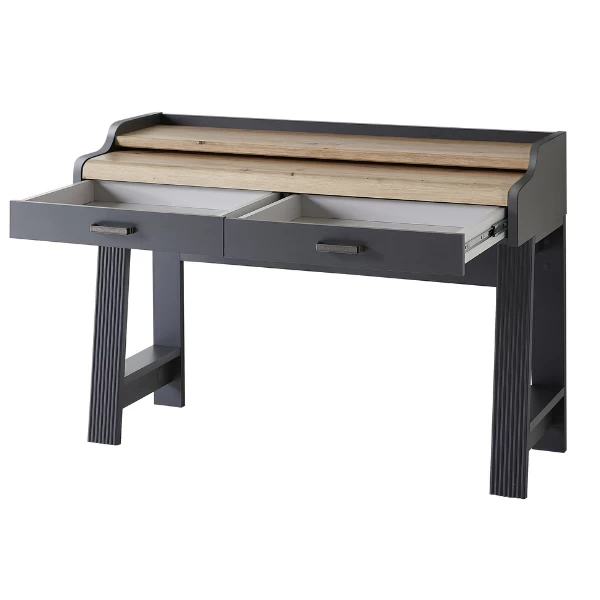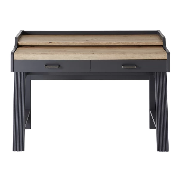 Optez pour le style de vie moderne et campagnard avec les meubles de la série Samine, qui sont fabriqués en panneaux de particules en graphite et avec des finitions en décor chêne. La série existe également en blanc. Ce secrétaire est doté d’un bureau coulissant, ce qui vous donne beaucoup d’espace pour travailler ou étudier sans que le meuble ne prenne trop de place. Grâce aux deux tiroirs de rangement, vous pouvez ranger proprement toutes vos fournitures de bureau. Découvrez l’ensemble de la collection Samine sur notre site web.