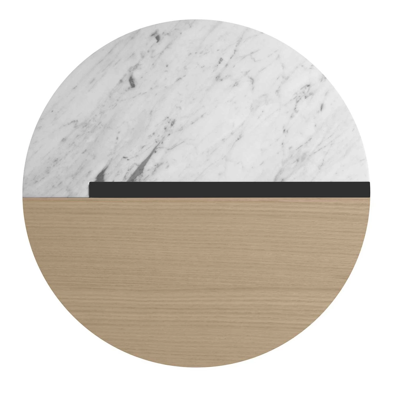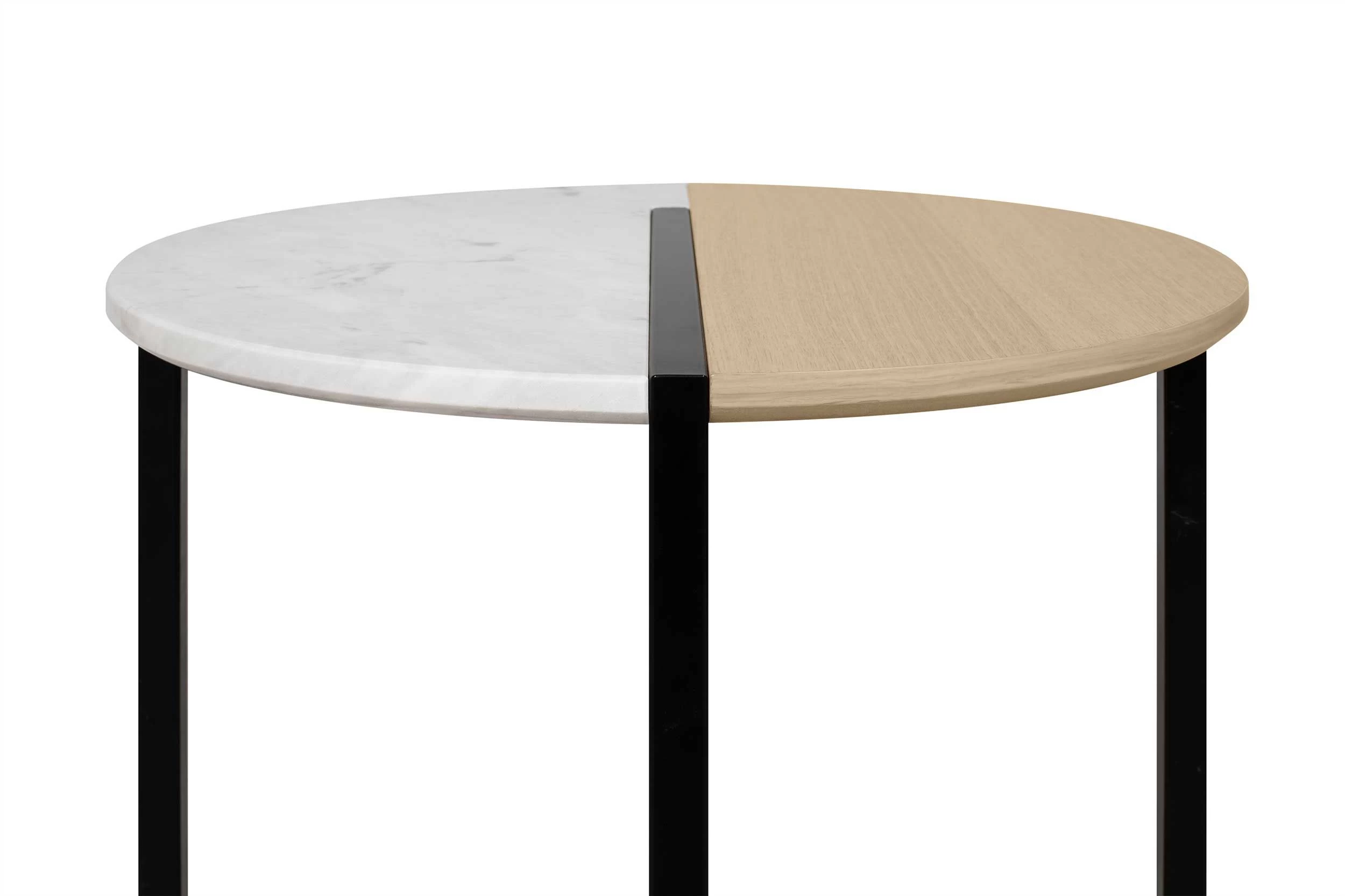 La table d’appoint Sonata sait parfaitement réunir différents matériaux. Le plateau se compose de 2 parties qui se rencontrent au milieu : une partie en marbre blanc et une partie en MDF avec finition en placage de chêne. Le piètement est fait en métal, un accent qui revient dans le plateau.